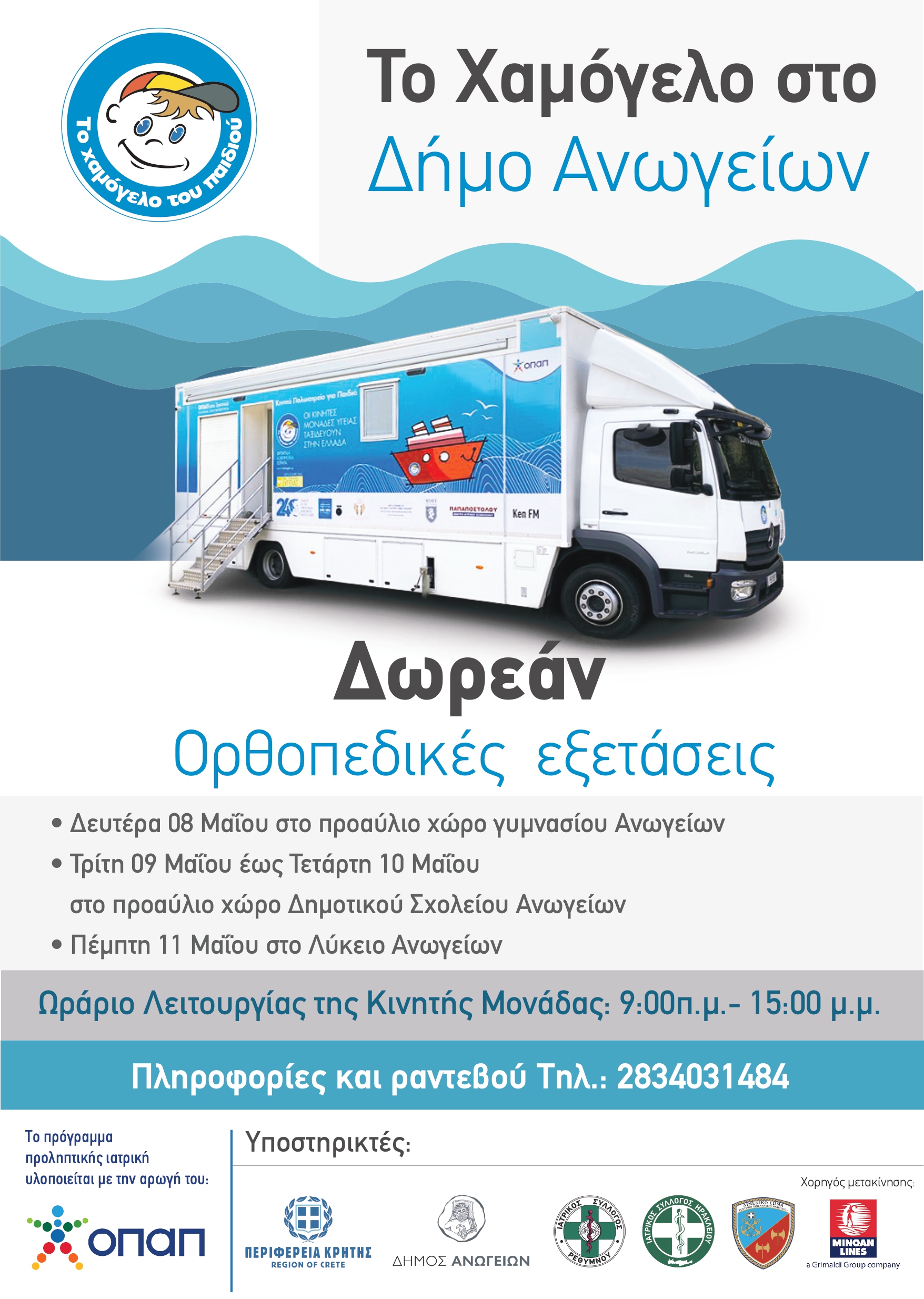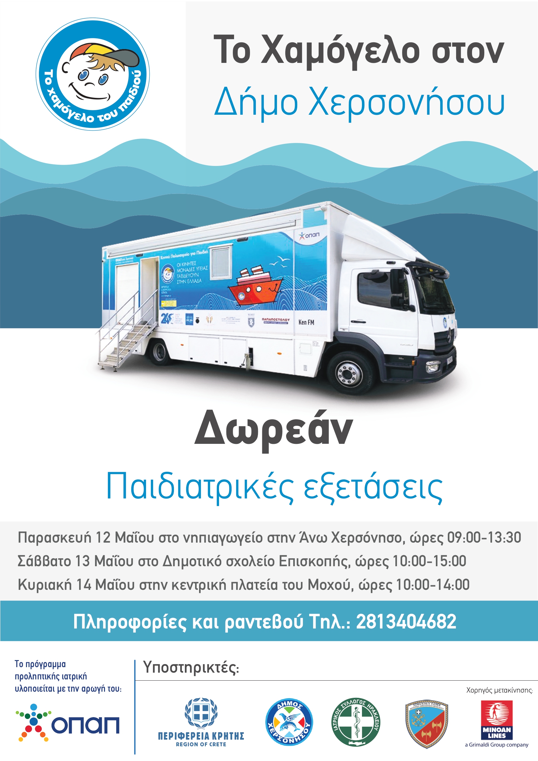 Αναλυτικά το πρόγραμμα των προληπτικών εξετάσεων από το “Χαμόγελο του Παιδιού” στους δήμους Χερσονήσου και Ανωγείων στα συνημμένα.