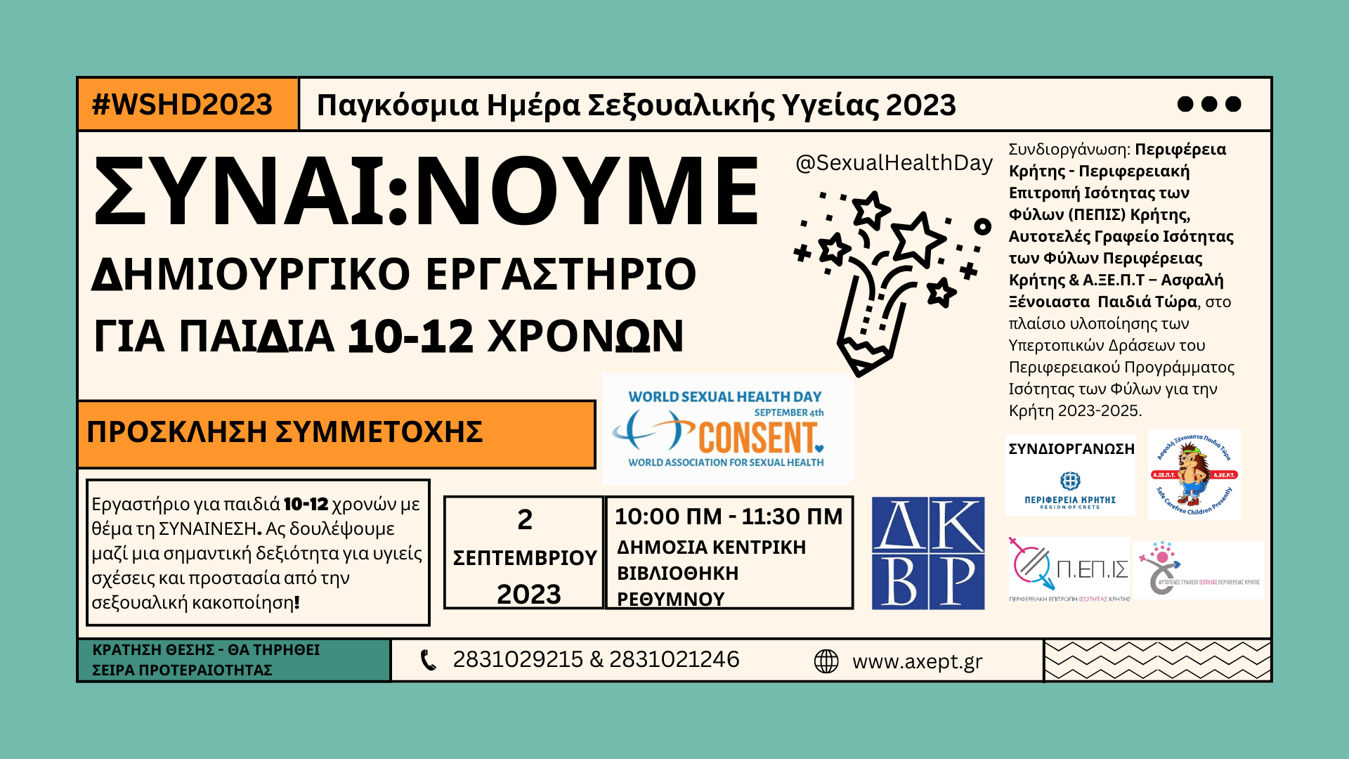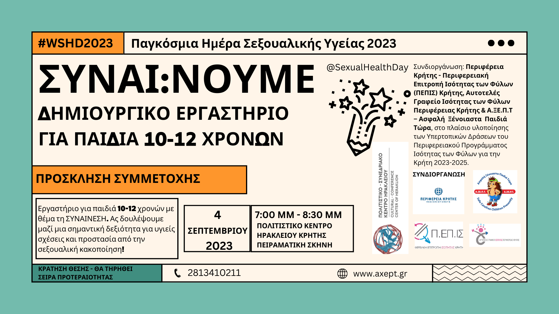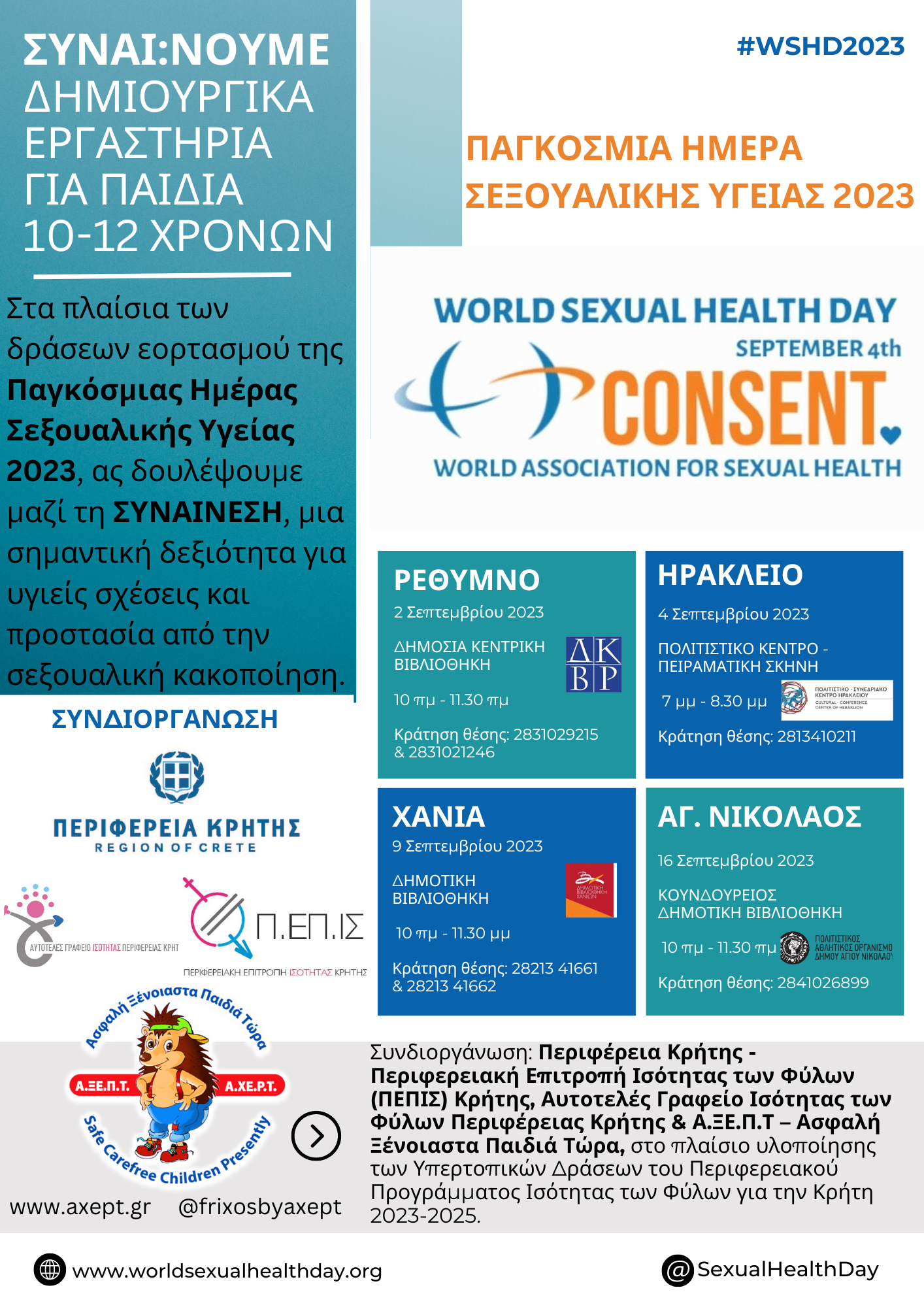Η Περιφέρεια Κρήτης, Περιφερειακή Επιτροπή Ισότητας των Φύλων Κρήτης (ΠΕΠΙΣ Κρήτης) και το Αυτοτελές Γραφείο Ισότητας των Φύλων, στο πλαίσιο των υπερτοπικών δράσεων του «Περιφερειακού Προγράμματος Ισότητας των Φύλων για την Κρήτη 2023-2025» και με αφορμή την «Παγκόσμια Ημέρα Σεξουαλικής Υγείας», υλοποιούν και στις τέσσερις Περιφερειακές Ενότητες δημιουργικά εργαστήρια, με τίτλο «ΣΥΝΑΙ:ΝΟΥΜΕ» και με θέμα: «Συναίνεση, μία σημαντική δεξιότητα για υγιείς σχέσεις και προστασία από τη σεξουαλική κακοποίηση», για παιδιά ηλικίας 10-12 ετών.