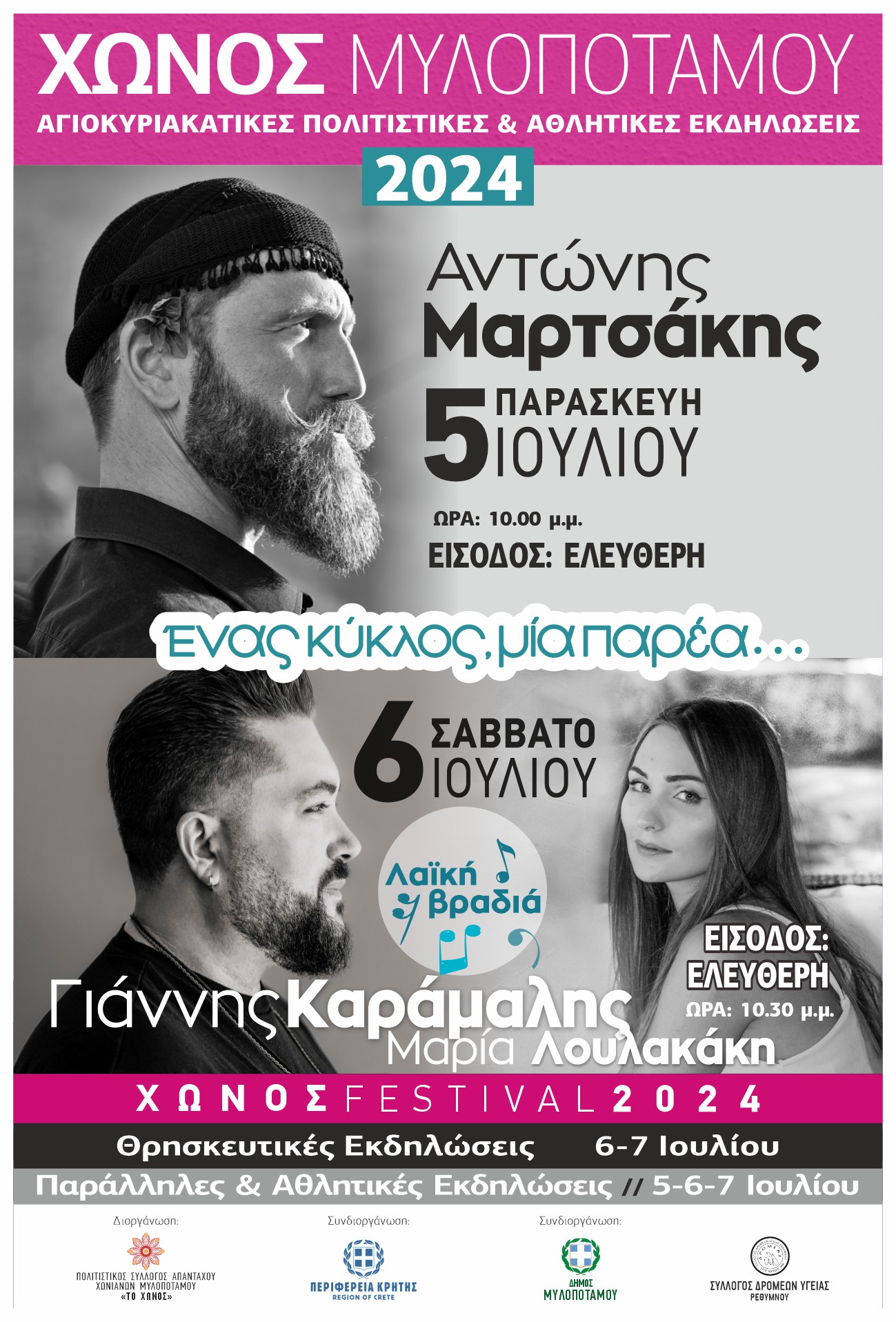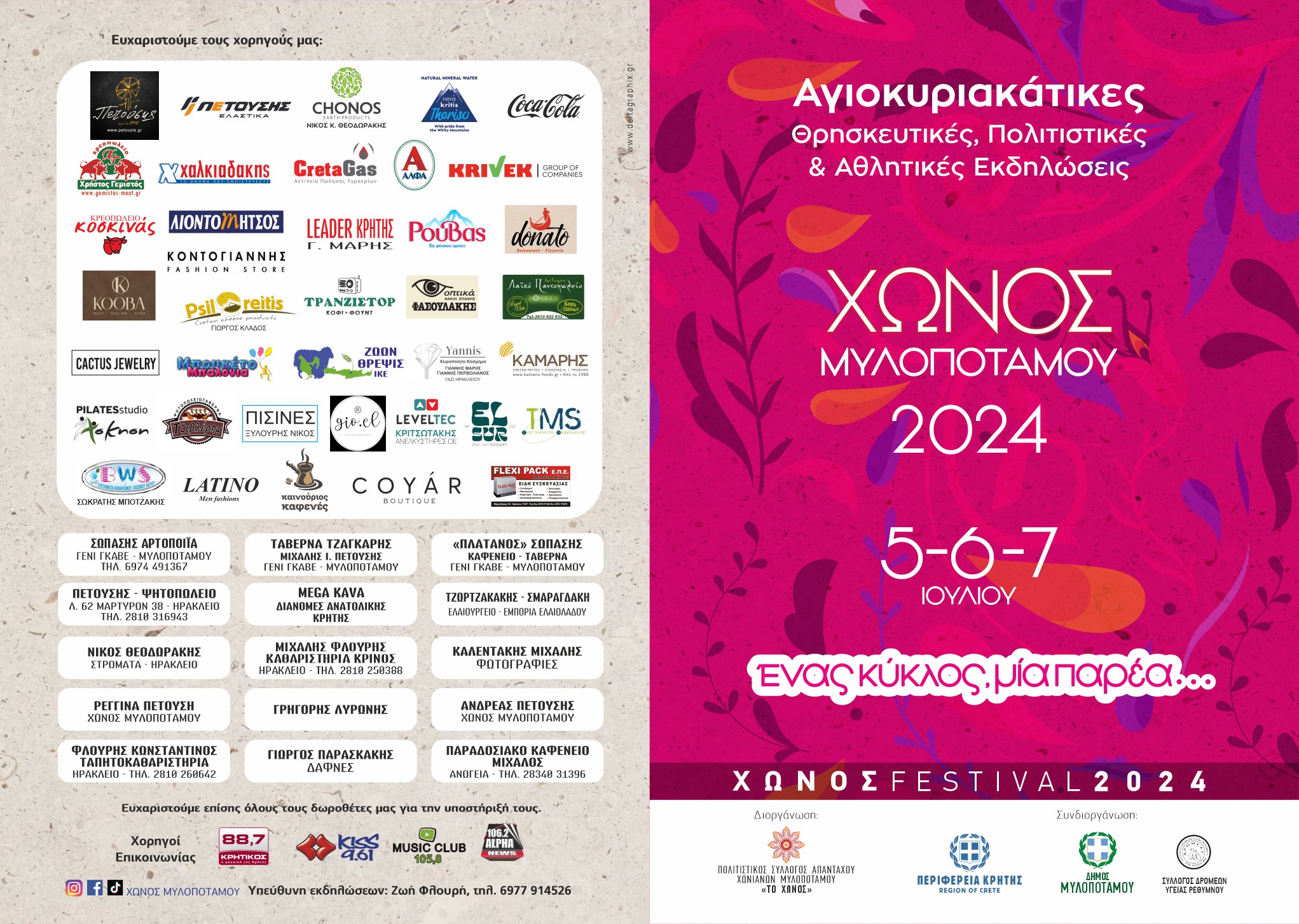 Συναυλίες, χοροί, εκθέσεις τέχνης, παιχνίδια για παιδιά και αθλητικές δραστηριότητες συνθέτουν το πρόγραμμα του «Χώνος Φέστιβαλ – Αγιοκυριακάτικες  Εκδηλώσεις 2024» που με αφορμή τον εορτασμό της Αγίας Κυριακής και για τρείς ημέρες, καθιστούν τον ορεινό όγκο του Μυλοποτάμου σε κέντρο πολιτισμού και γνήσιας κρητικής ψυχαγωγίας και φιλοξενίας.