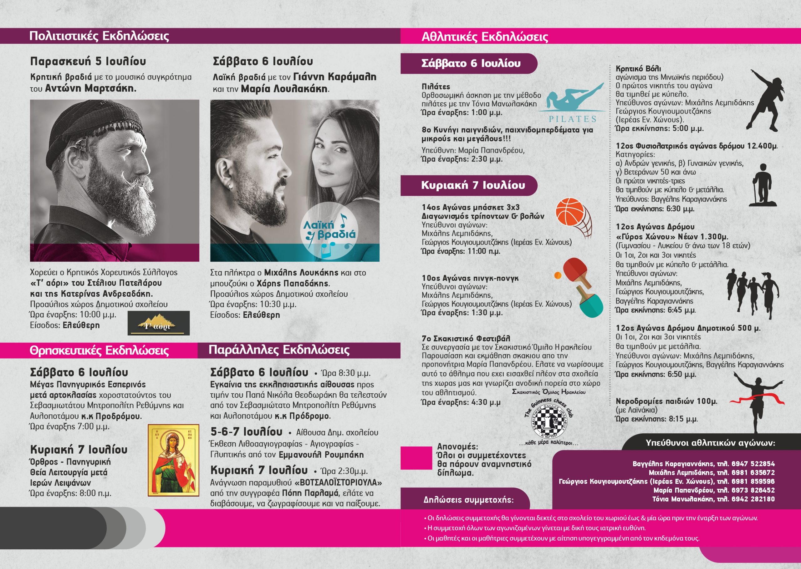 Περιλαμβάνουν φυσιολατρικούς αγώνες δρόμου, πιλάτες, αγώνες μπάσκετ και πινγκ-πονγκ. Σκακιστικό φεστιβάλ και Κρητικό Βόλι (αγώνισμα της Μινωϊκής περιόδου) ενώ τα παιδιά θα διαγωνισθούν σε Νεροδρομίες.
