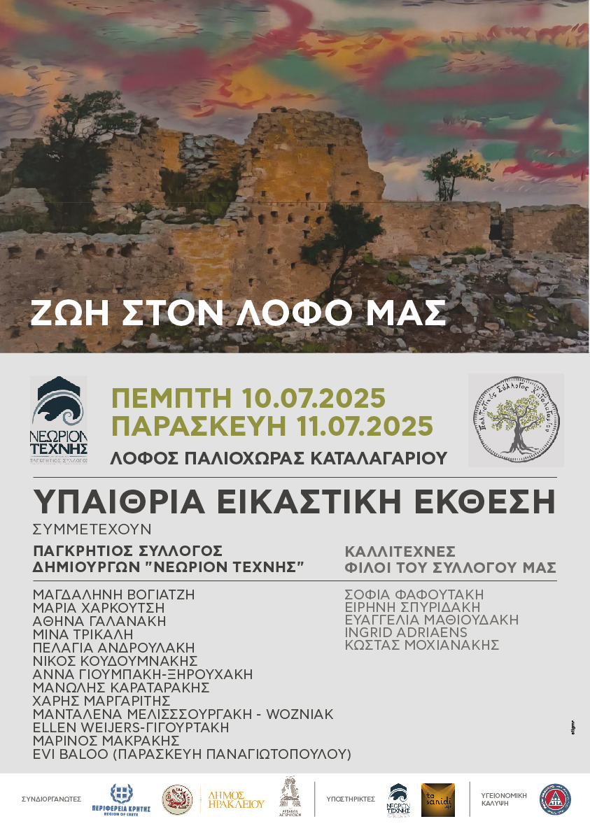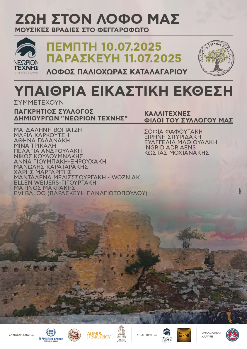 Παράλληλα, και τις δύο ημέρες, στον λόφο της Παλιόχωρας θα λειτουργεί υπαίθρια εικαστική έκθεση με τίτλο “Αναγέννηση”, με έργα του Παγκρήτιου Συλλόγου Δημιουργών «Νεώριον Τέχνης», καθώς και καλλιτεχνών που είναι φίλοι του Πολιτιστικού Συλλόγου Καταλαγαρίου.