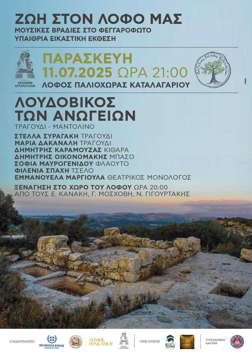 Πριν την έναρξη της συναυλίας της Παρασκευής 11 Ιουλίου, στις 20:00, οι αρχαιολόγοι Ελένη Κανάκη, Γωγώ Μοσχόβη και Νίκος Γιγουρτάκης θα μας ξεναγήσουν στα μνημεία του λόφου: το συγκρότημα των λαξευτών πατητηριών, το μεσαιωνικό φρούριο Κάστελος, αργότερα κάστρο των Κορνάρων (Castello del Cornaro) και τον ναό της Παναγίας Ζωοδόχου Πηγής.