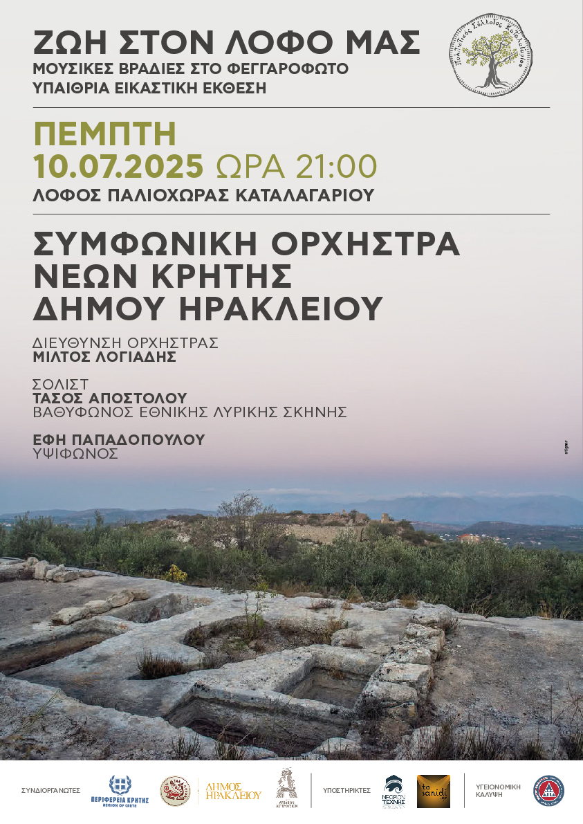 Πιο συγκεκριμένα, την Πέμπτη 10 Ιουλίου και ώρα 21:00, πάνω στον λόφο της Παλιόχωρας, δίπλα στο κάστρο των Κορνάρων, στο βυζαντινό εκκλησάκι της Ζωοδόχου Πηγής και ανάμεσα στους διάσπαρτους ελαιώνες, η Συμφωνική Ορχήστρα Νέων Κρήτης Δήμου Ηρακλείου, υπό τη διεύθυνση του Μίλτου Λογιάδη, με σολίστ τον βαθύφωνο της Εθνικής Λυρικής Σκηνής Τάσο Αποστόλου και την υψίφωνο Έφη Παπαδοπούλου, θα μας ταξιδέψουν με γνώριμα τραγούδια Ελλήνων συνθετών.