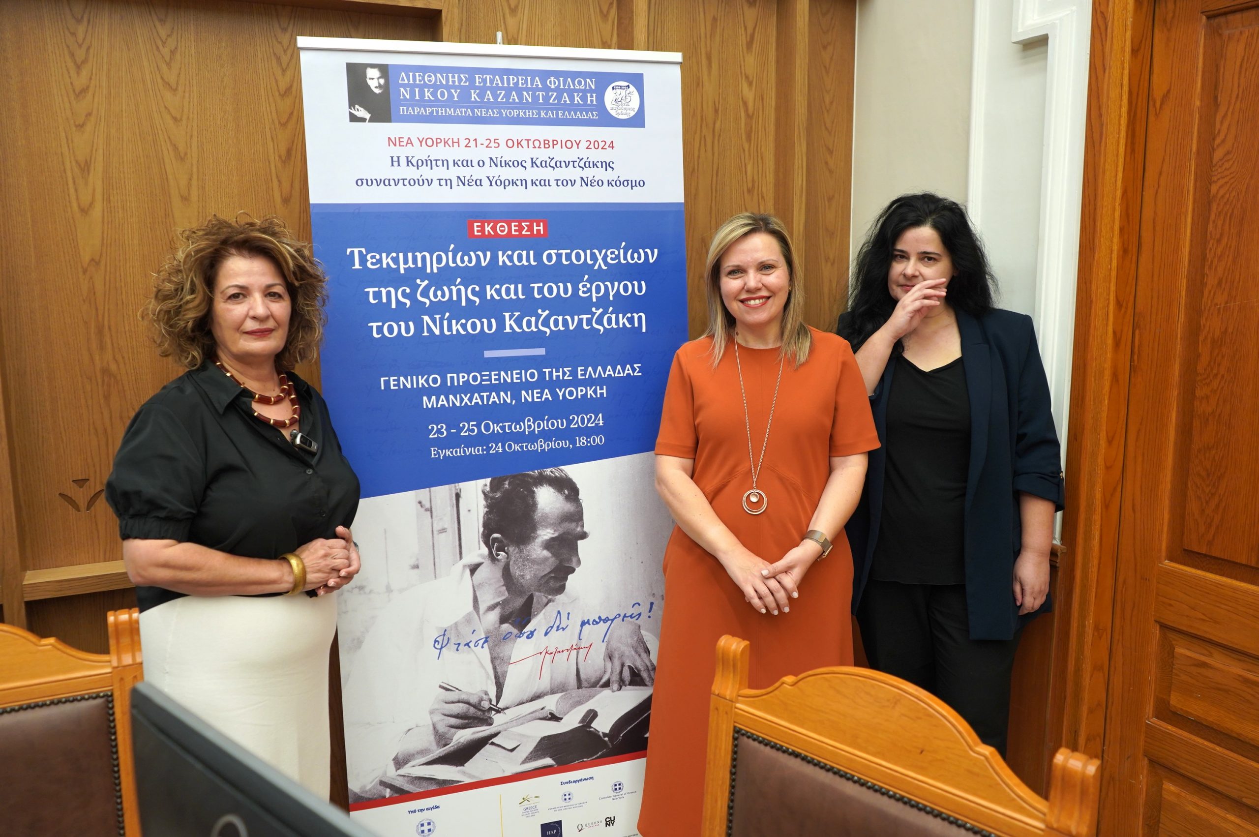 Οι σπουδαίες εκδηλώσεις με τίτλο «Η Κρήτη και ο Νίκος Καζαντζάκης συναντούν τη Νέα Υόρκη και τον Νέο Κόσμο» που πρόκειται να πραγματοποιηθούν στη Νέα Υόρκη, από 21 έως 25 Οκτωβρίου 2024, με την υποστήριξη της Περιφέρειας Κρήτης, τη Διεθνή Εταιρεία Φίλων Νίκου Καζαντζάκη (ΔΕΦΝΚ)-Παραρτήματα Νέας Υόρκης και Ελλάδας και το Μουσείο Νίκος Καζαντζάκης, παρουσιάστηκαν σήμερα στη Περιφέρεια Κρήτης στο πλαίσιο συνέντευξης τύπου από την Αντιπεριφερειάρχη Πολιτισμού και Ισότητας Γωγώ Μηλάκη, τη διευθύντρια του Μουσείου Νίκου Καζαντζάκη Μαριλένα Μηλαθιανάκη και το μέλος του δ.σ. της ΔΕΦΝΚ Μαρία Ζαχαριάκη.