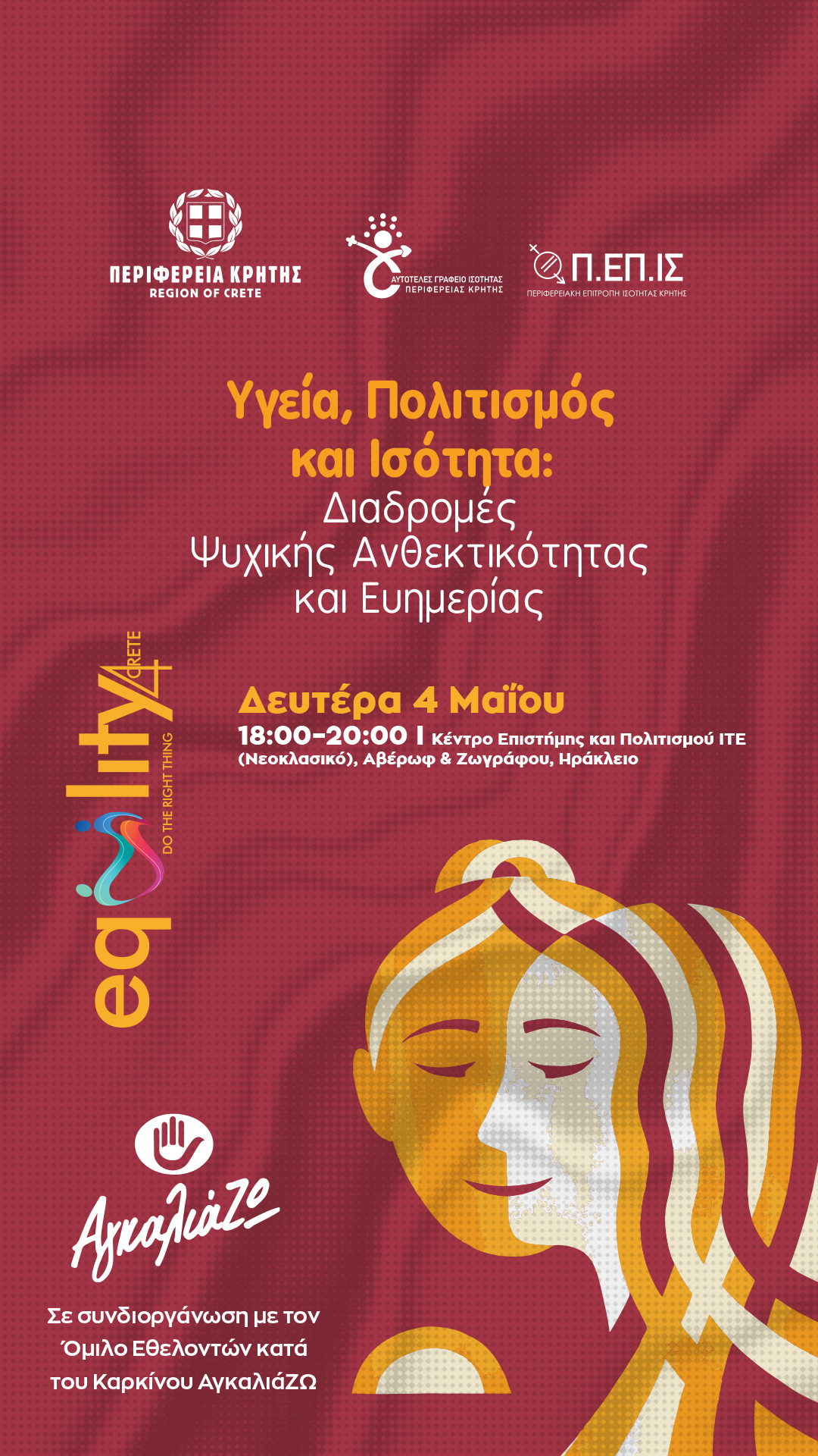 Η Περιφέρεια Κρήτης διοργανώνει τη Δευτέρα 4 Μαΐου, από τις 18:00 έως τις 20:00, στο Κέντρο Επιστήμης και Πολιτισμού του ΙΤΕ (Νεοκλασικό κτίριο, Αβέρωφ & Ζωγράφου, Ηράκλειο), εκδήλωση με τίτλο «Υγεία, Πολιτισμός και Ισότητα: Διαδρομές Ψυχικής Ανθεκτικότητας και Ευημερίας», σε συνεργασία με τον Όμιλο Εθελοντών κατά του Καρκίνου «ΑγκαλιάΖΩ».