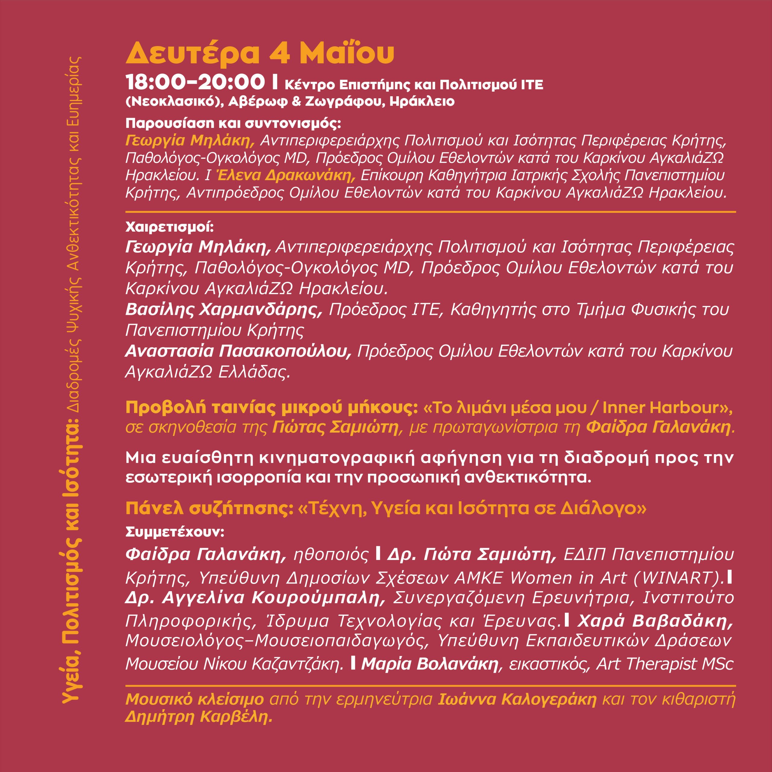Στο πλαίσιο της εκδήλωσης θα πραγματοποιηθεί προβολή της ταινίας μικρού μήκους «Το λιμάνι μέσα μου / Inner Harbour», σε σκηνοθεσία της Γιώτας Σαμιώτη, με πρωταγωνίστρια τη Φαίδρα Γαλανάκη, μια ευαίσθητη κινηματογραφική αφήγηση για τη διαδρομή προς την εσωτερική ισορροπία και την προσωπική ανθεκτικότητα. Θα ακολουθήσει πάνελ συζήτησης, με θέμα «Τέχνη, Υγεία και Ισότητα σε Διάλογο», με τη συμμετοχή γυναικών επαγγελματιών από τους χώρους της υγείας, της τέχνης και του πολιτισμού. Η εκδήλωση θα ολοκληρωθεί μουσικά με την ερμηνεύτρια Ιωάννα Καλογεράκη και του κιθαριστή Δημήτρη Καρβέλη.