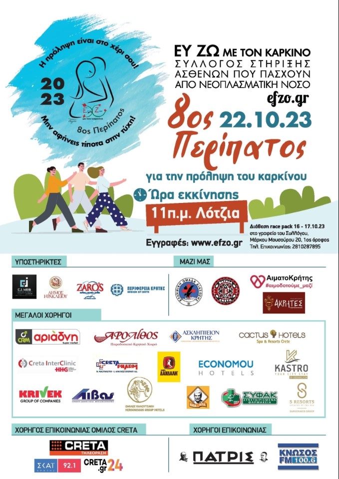 Ο Σύλλογος στήριξης ασθενών με νεοπλασματική νόσο «Ευ Ζω με τον Καρκίνο», με την υποστήριξη της Περιφέρειας Κρήτης θα πραγματοποιήσει και φέτος για 8η συνεχή χρονιά, στις 22 Οκτωβρίου, ημέρα Κυριακή και ώρα 11 π.μ, «Περίπατο για την πρόληψη του Καρκίνου». Το σημείο εκκίνησης και ο τερματισμός θα είναι έξω από τη Λότζια.