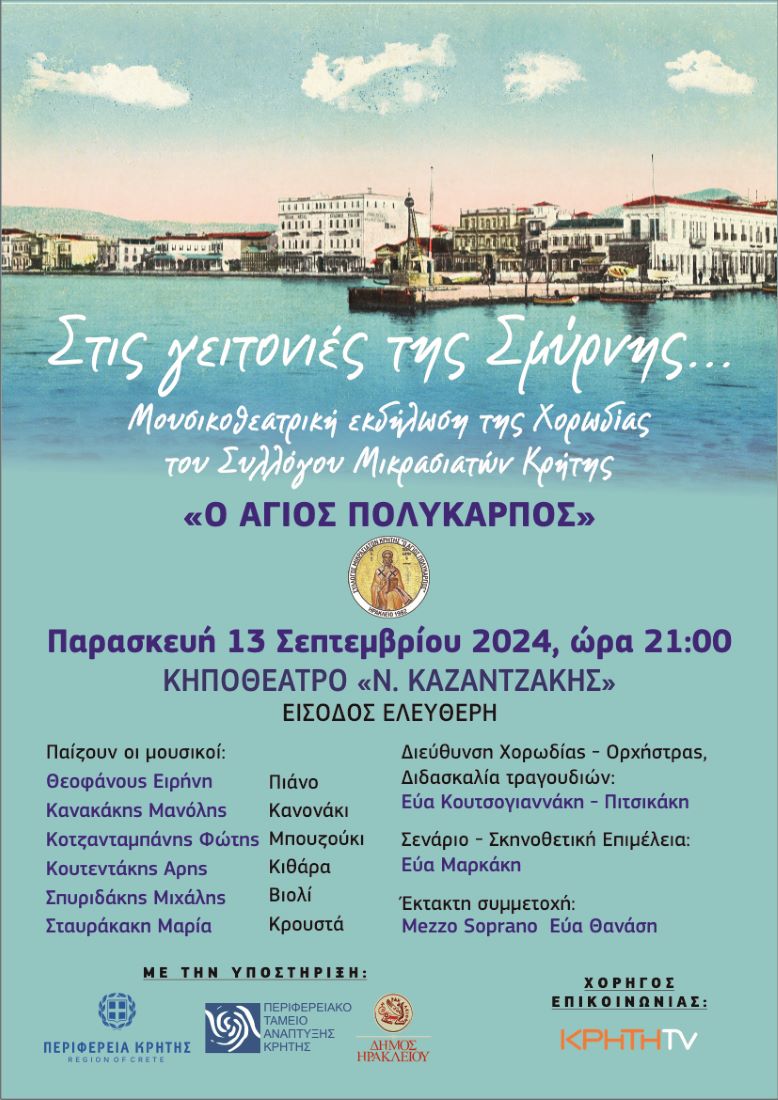 Ο Σύλλογος Μικρασιατών Κρήτης «Ο Αγ. Πολύκαρπος και  η Χορωδία του Συλλόγου την Παρασκευή 13 Σεπτεμβρίου 2024 ώρα 21:00 στο Κηποθέατρο Ν. Καζαντζάκης, παρουσιάζει με τη στήριξη της Περιφέρειας Κρήτης  και δωρεάν είσοδο την μουσικοθεατρική παράσταση με τίτλο: