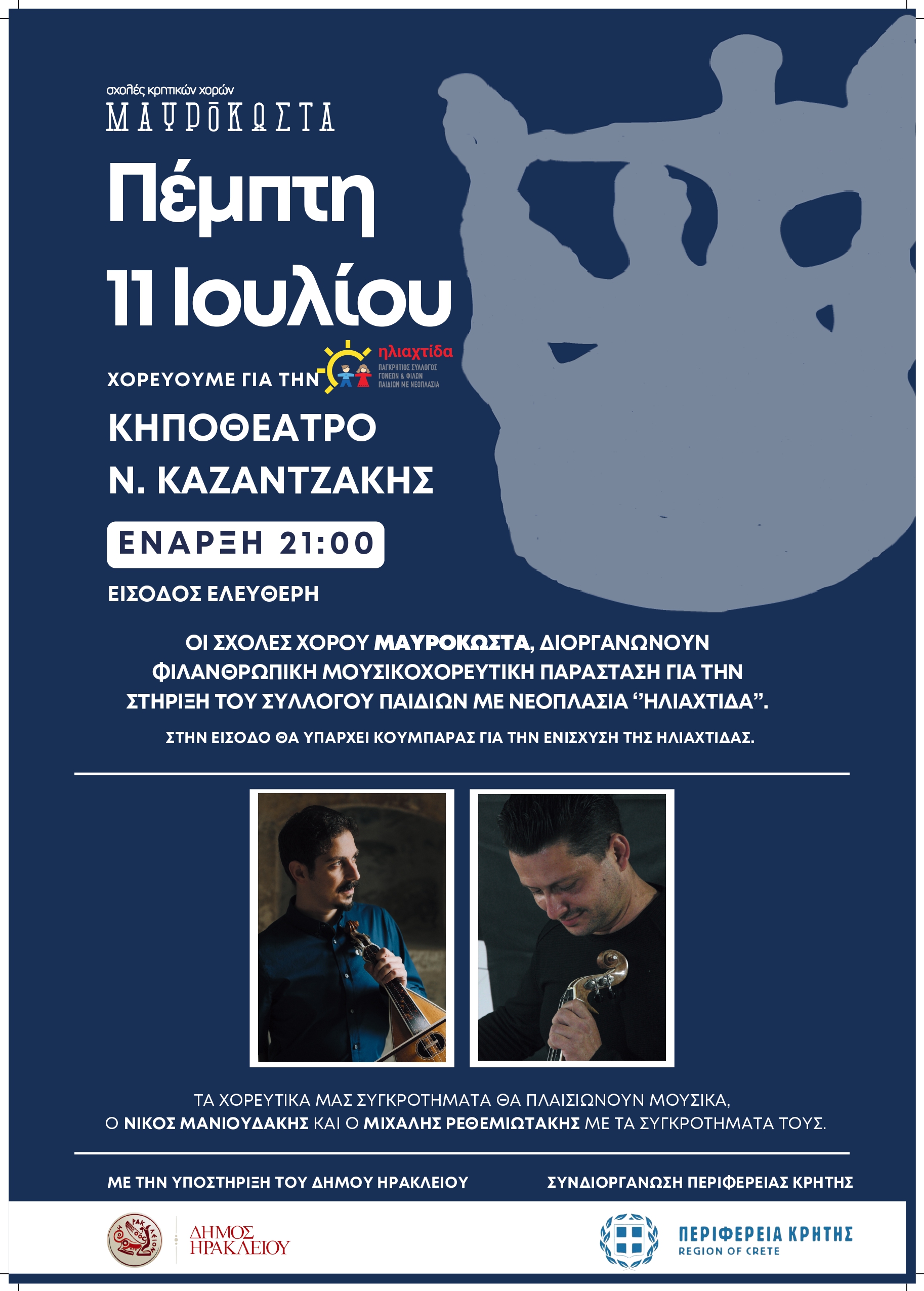 Οι Σχολές κρητικών χορών Μαυρόκωστα διοργανώνουν για μια ακόμη χρονιά, την μουσικοχορευτική, φιλανθρωπική εκδήλωση ‘’Χορεύουμε για την Ηλιαχτίδα’’ με σκοπό την στήριξη του έργου του Συλλόγου παιδιών με νεοπλασία ‘’ΗΛΙΑΧΤΙΔΑ’’.