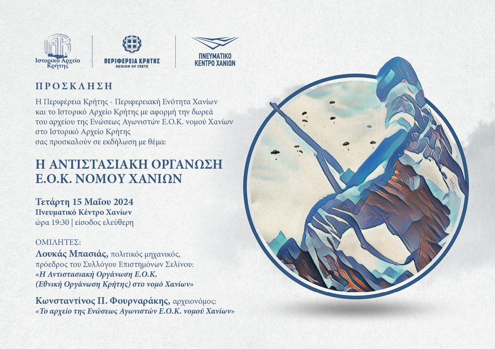 Με αφορμή την παράδοση του αρχείου της Ενώσεως Αγωνιστών Ε.Ο.Κ. νομού Χανίων (1945-2018) στο Ιστορικό Αρχείο Κρήτης, το Ιστορικό Αρχείο Κρήτης με τη στήριξη της Περιφέρειας Κρήτης-Περιφερειακή Ενότητα Χανίων και του Πνευματικού Κέντρου Χανίων διοργανώνει εκδήλωση, την Τετάρτη 15 Μαΐου 2024, και ώρα 19:30, στο Πνευματικό Κέντρο Χανίων με θέμα «Η Αντιστασιακή Οργάνωση Ε.Ο.Κ. Χανίων» με το εξής πρόγραμμα: