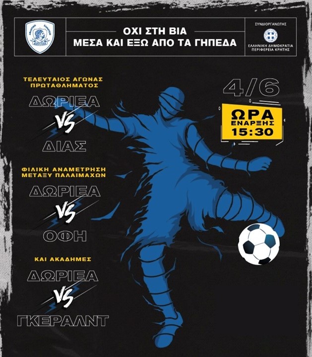 Ο αθλητικός σύλλογος Δωριέας με την υποστήριξη της Περιφέρειας Κρήτης, πραγματοποιεί την Κυριακή 4 Ιουνίου την αθλητική εκδήλωση με τίτλο : «Όχι στη βία, μέσα και έξω από τα γήπεδα». Η εκδήλωση θα πραγματοποιηθεί στις 17:30 στο γήπεδο ποδοσφαίρου στο Καστέλι Πεδιάδας.