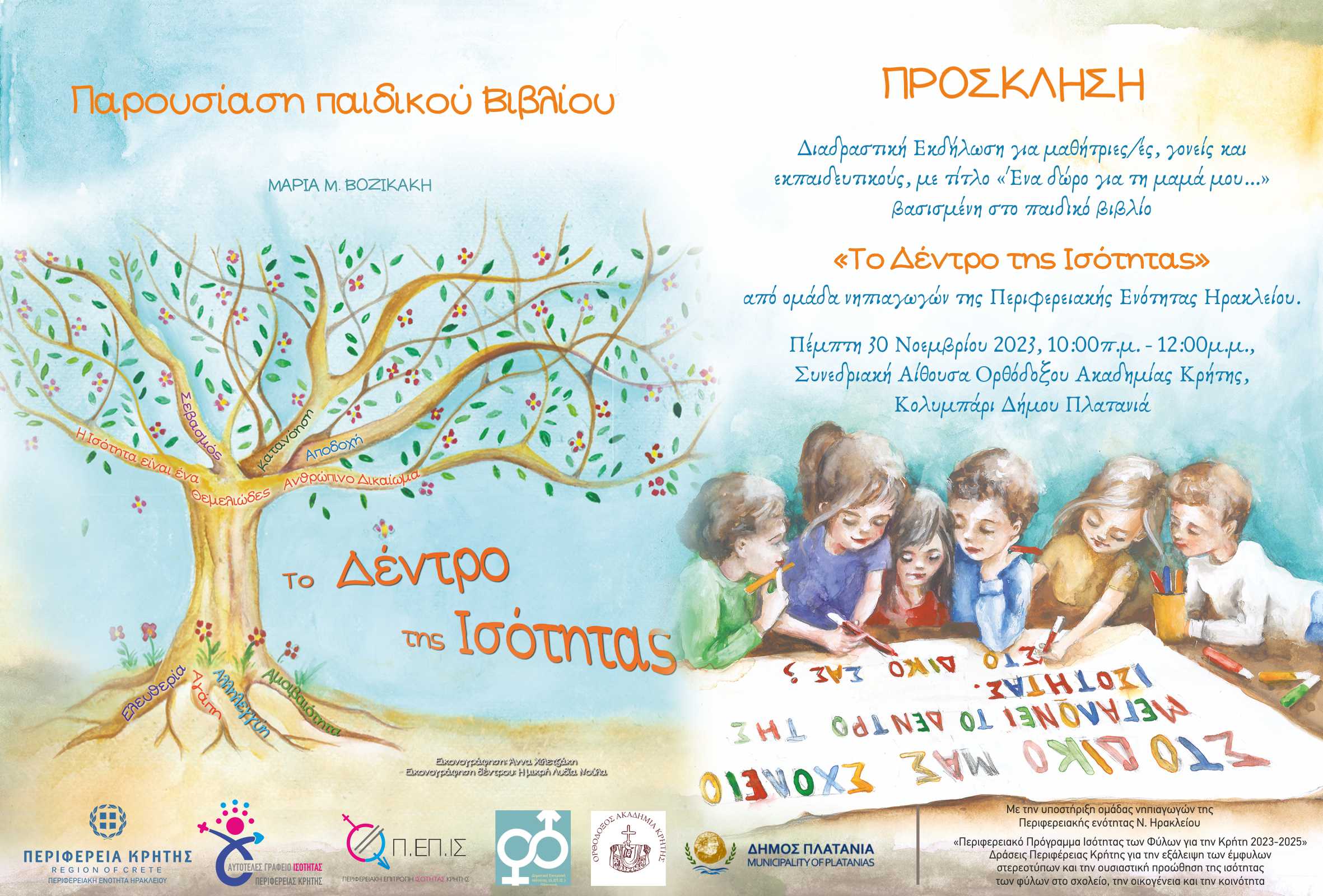 Την Πέμπτη 30 Νοεμβρίου 2023 και ώρα 10:00 το πρωί, στη Συνεδριακή Αίθουσα της Ορθόδοξου Ακαδημίας Κρήτης, στο Κολυμπάρι του Δήμου Πλατανιά, πρόκειται να πραγματοποιηθεί, με την υποστήριξη του Δήμου Πλατανιά και της Δημοτικής Επιτροπής Ισότητας Πλατανιά, η εκδήλωση παρουσίασης του παιδικού βιβλίου της Μαρίας Μ. Βοζικάκη, «Το Δέντρο της Ισότητας», που έχει εκδοθεί από την Περιφέρεια Κρήτης, Διεύθυνση Κοινωνικής Μέριμνας.