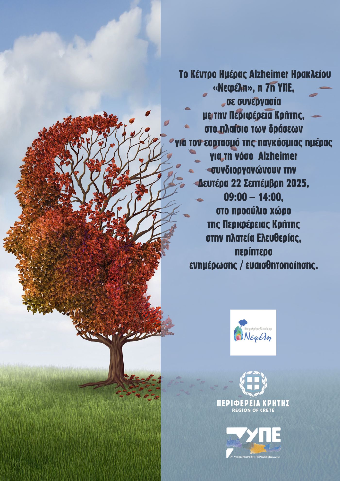 Το Κέντρο Ημέρας Alzheimer Ηρακλείου «Νεφέλη» και η 7η Υγειονομική Περιφέρεια Κρήτης, σε συνεργασία με την Περιφέρεια Κρήτης, συνδιοργανώνουν ενημερωτική εκδήλωση στο πλαίσιο της παγκόσμιας ημέρας για τη νόσο Alzheimer που έχει καθιερωθεί στις 21 Σεπτεμβρίου.