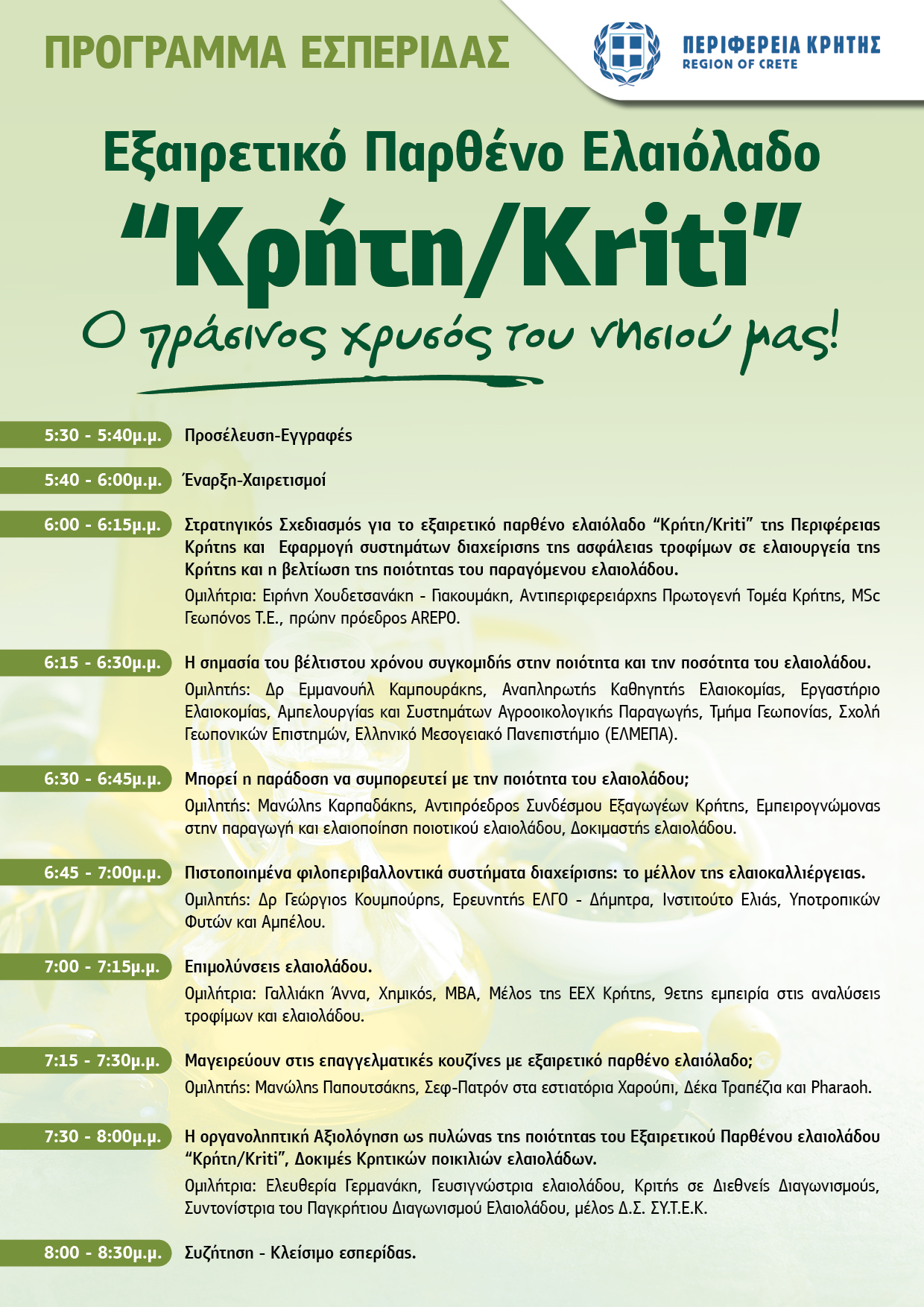 Στρατηγικός Σχεδιασμός για το εξαιρετικό παρθένο ελαιόλαδο “Κρήτη/Kriti” της Περιφέρειας Κρήτης και Εφαρμογή συστημάτων διαχείρισης της ασφάλειας τροφίμων σε ελαιουργεία της Κρήτης και η βελτίωση της ποιότητας του παραγόμενου ελαιολάδου.