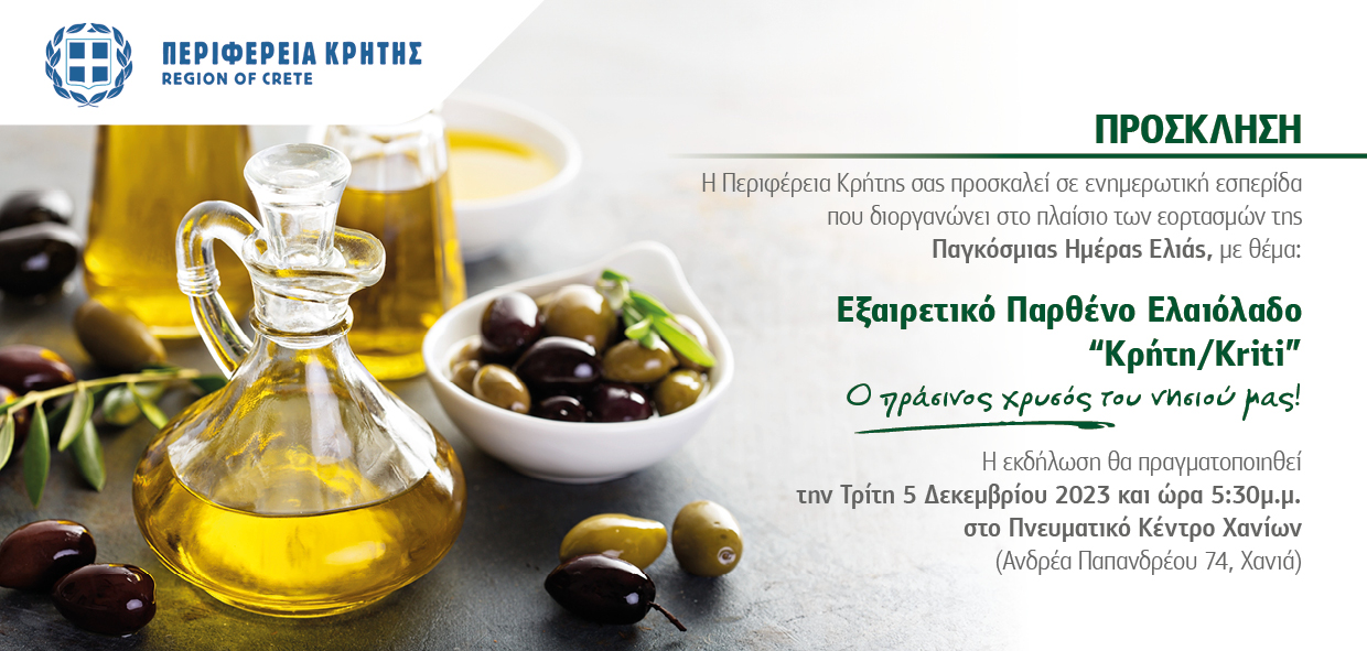Η Περιφέρεια Κρήτης διοργανώνει στο πλαίσιο των εορτασμών της Παγκόσμιας Ημέρας Ελιάς ενημερωτική εσπερίδα αφιερωμένη στο εξαιρετικό παρθένο ελαιόλαδο «Κρήτη/Kriti» με θέμα «Εξαιρετικό Παρθένο Ελαιόλαδο «Κρήτη/Kriti», ο πράσινος χρυσός του νησιού μας», την Τρίτη 5 Δεκεμβρίου 2023 και ώρα 17:30, στο Πνευματικό Κέντρο Χανίων (Ανδρέα Παπανδρέου 74, Χανιά).