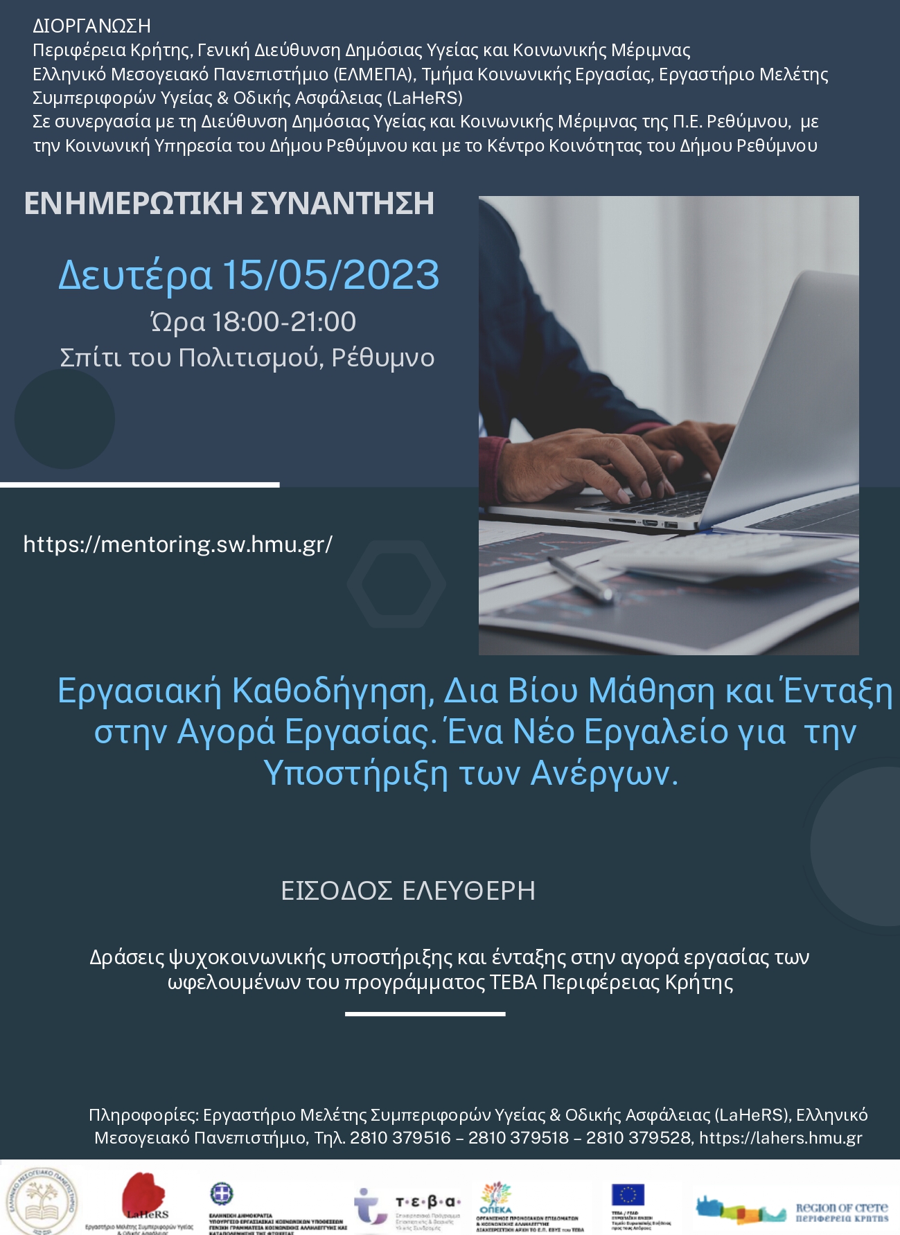 Τη Δευτέρα, 15 Μαΐου 2023 και ώρα 6:00-9:00μ.μ, στο «Σπίτι του Πολιτισμού», σε συνεργασία με τη Διεύθυνση Δημόσιας Υγείας και Κοινωνικής Μέριμνας της Π.Ε. Ρεθύμνου, την Κοινωνική Υπηρεσία και το Κέντρο Κοινότητας του Δήμου Ρεθύμνου, πρόκειται να πραγματοποιηθεί δια ζώσης η επόμενη ενημερωτική συνάντηση στην οποία καλούνται εργοδότες, άνεργοι, επιχειρηματίες, ωφελούμενοι του ΤΕΒΑ, αλλά και ιδιώτες, για να ενημερωθούν για τις ωφέλειες που μπορούν να λάβουν από την πλατφόρμα Mentoring. Είσοδος ελεύθερη.