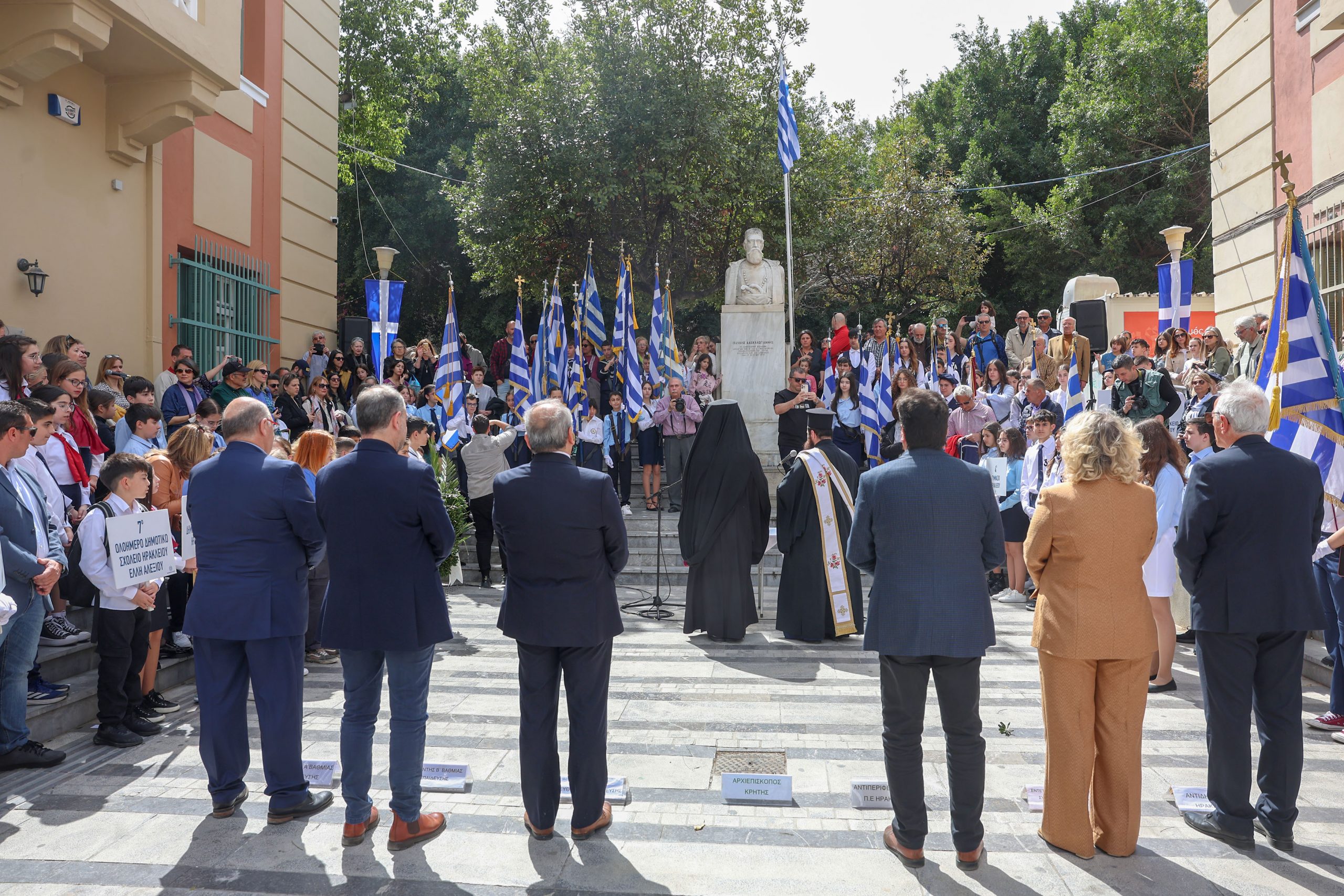 Την επιμνημόσυνη δέηση τέλεσε ο Πρωτοσύγκελος της Ιεράς Αρχιεπισκοπής Κρήτης κ. Βαρθολομαίος Βογιατζόγλου ενώ στο μνημείο, παρουσία του Αντιπεριφερειάρχη Ηρακλείου Νίκου Συριγωνάκη, κατέθεσαν στεφάνια οι: Εντεταλμένη Περιφερειακή Σύμβουλος Παιδείας και Δια Βίου Μάθησης Ελένη Μαράκη-Μπελαδάκη, ο Αντιδήμαρχος Ηρακλείου στο τομέα Παιδείας Αντώνης Περισυνάκης, ο Περιφερειακός Διευθυντής Εκπαίδευσης Κρήτης Μανόλης Καρτσωνάκης, οι Διευθυντές Πρωτοβάθμιας Μανόλης Μπελαδάκης και Δευτεροβάθμιας Εκπαίδευσης Αντώνης Φουντουλάκης, εκπρόσωποι μαθητών Δημοτικών, Γυμνασίων και Λυκείων Ηρακλείου, του Σώματος Ελληνικού Οδηγισμού και των Προσκόπων.