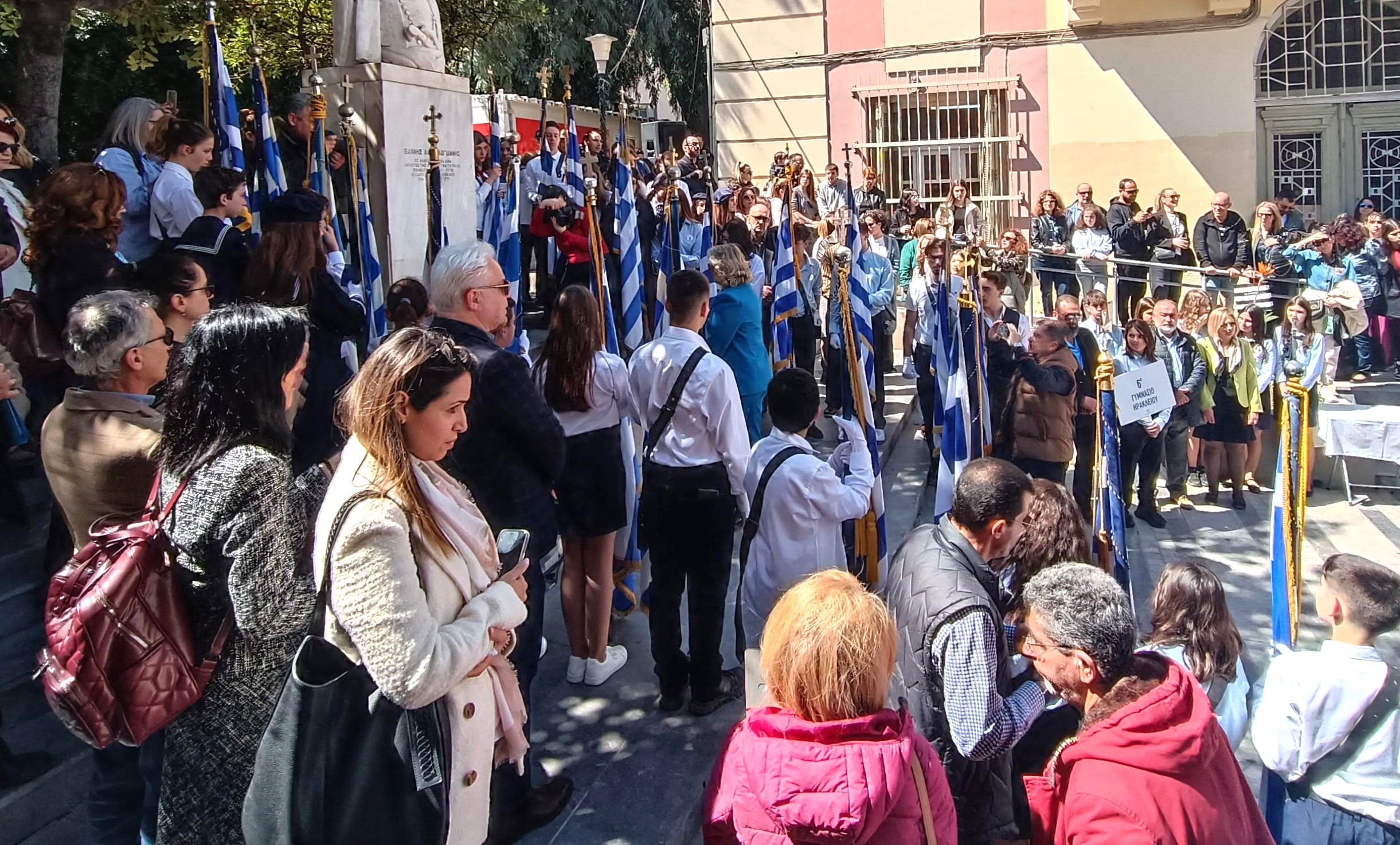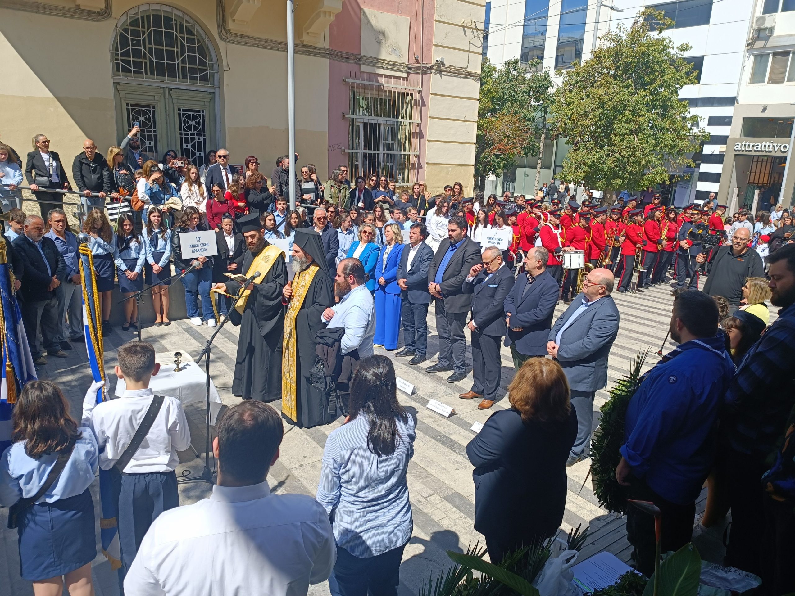 Την επιμνημόσυνη δέηση τέλεσε ο Πρωτοσύγκελος της Ιεράς Αρχιεπισκοπής Κρήτης κ. Βαρθολομαίος Βογιατζόγλου ενώ στο μνημείο, παρουσία των Αντιπεριφερειαρχών Ηρακλείου Νίκου Συριγωνάκη, Κρήτης Γωγώς Μηλάκη και Σταύρου Τζεδάκη, κατέθεσαν στεφάνια οι: Εντεταλμένη Περιφερειακή Σύμβουλος Παιδείας και Δια Βίου Μάθησης Ελένη Μαράκη-Μπελαδάκη, ο Αντιδήμαρχος Ηρακλείου στο τομέα Παιδείας Αντώνης Περισυνάκης, ο Περιφερειακός Διευθυντής Εκπαίδευσης Κρήτης Μανόλης Καρτσωνάκης, οι Διευθυντές Πρωτοβάθμιας Μανόλης Μπελαδάκης και Δευτεροβάθμιας Εκπαίδευσης Αντώνης Φουντουλάκης, εκπρόσωποι μαθητών Δημοτικών, Γυμνασίων και Λυκείων Ηρακλείου, του Σώματος Ελληνικού Οδηγισμού και των Προσκόπων.