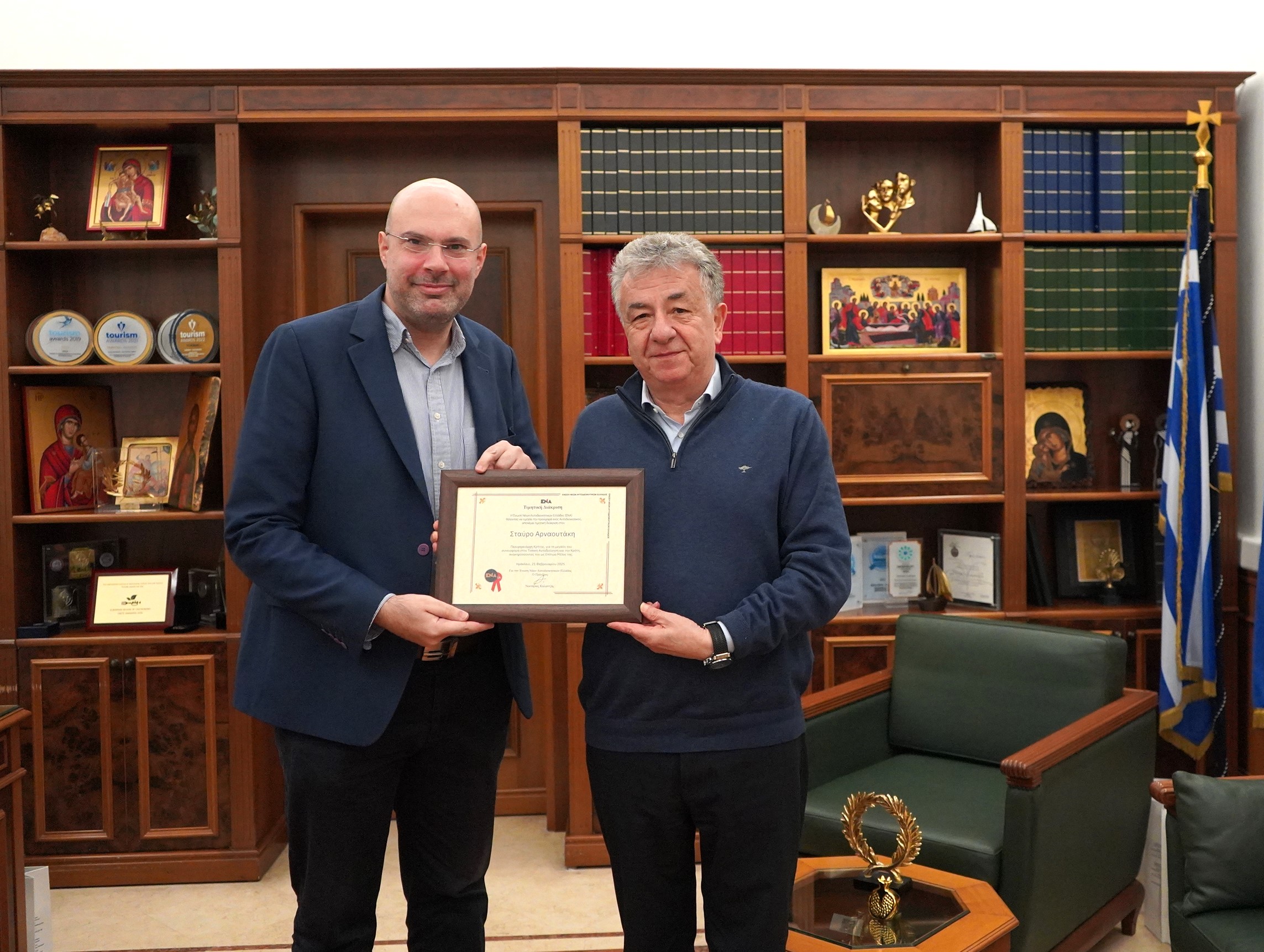 Ο κ. Καλαντζής στο πλαίσιο της επίσκεψης του στην Περιφέρεια ενημέρωσε τον κ. Αρναουτάκη για τις δράσεις της Ε.Ν.Α. ανά την Ελλάδα, και τον βράβευσε για την συνολική του προσφορά στην Ελληνική Τοπική Αυτοδιοίκηση. Παράλληλα ανακήρυξε τον Περιφερειάρχη Κρήτης σε επίτιμο μέλος της Ε.Ν.Α.