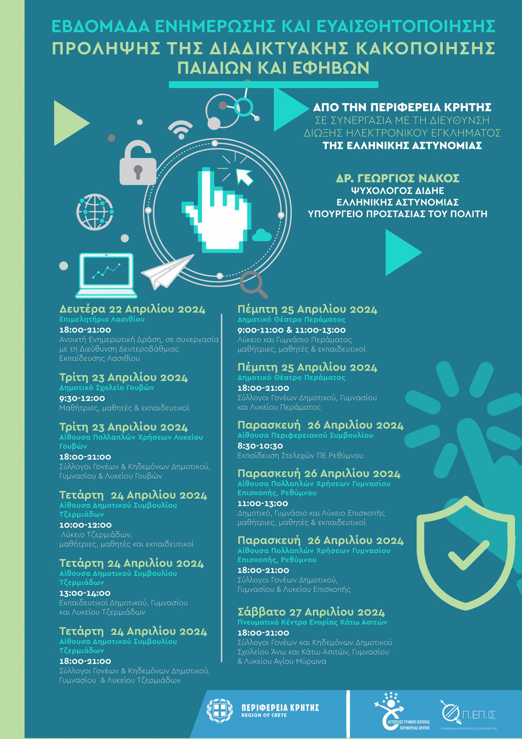 Η Περιφέρεια Κρήτης, το Αυτοτελές Γραφείο Ισότητας και η Περιφερειακή Επιτροπή Ισότητας των Φύλων Κρήτης, στο πλαίσιο του «Περιφερειακού Σχεδίου Δράσης Κρήτης για την Ισότητα των Φύλων 2023-2025», συνεχίζουν τη συνεργασία τους με τη Διεύθυνση Δίωξης Ηλεκτρονικού Εγκλήματος της Ελληνικής Αστυνομίας, πραγματοποιώντας ενημερωτικές δράσεις για την ασφαλή πλοήγηση στο διαδίκτυο, τους διαδικτυακούς κινδύνους και τις πρακτικές αντιμετώπισής τους από την Τρίτη 23 Απριλίου έως και το Σάββατο 27 Απριλίου 2024.