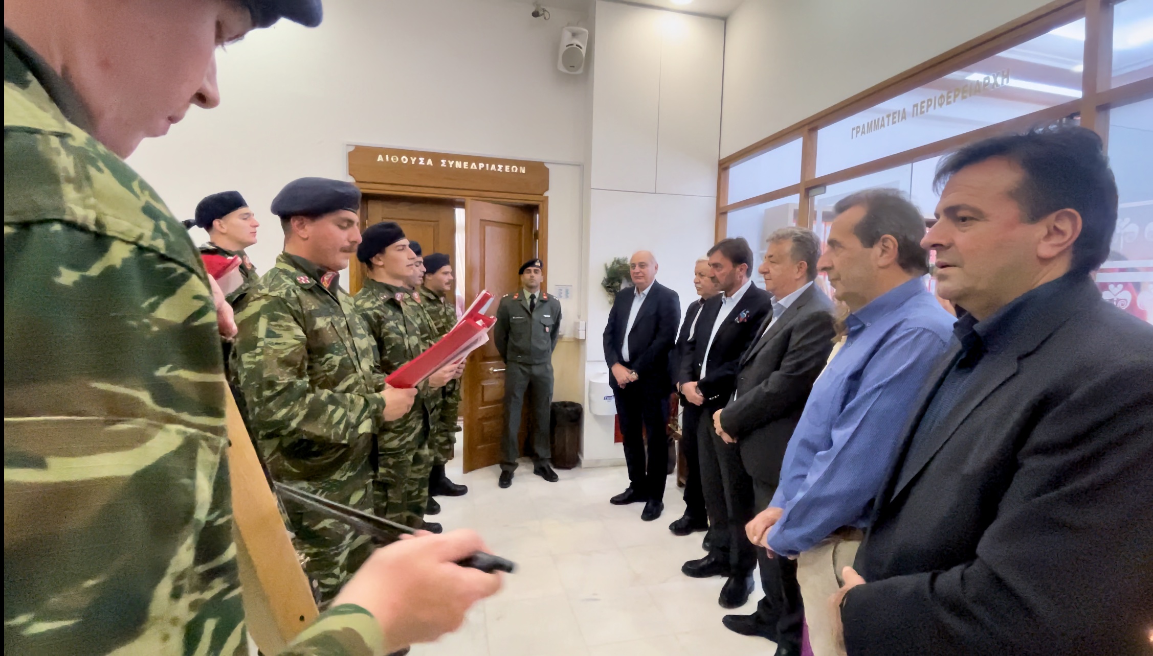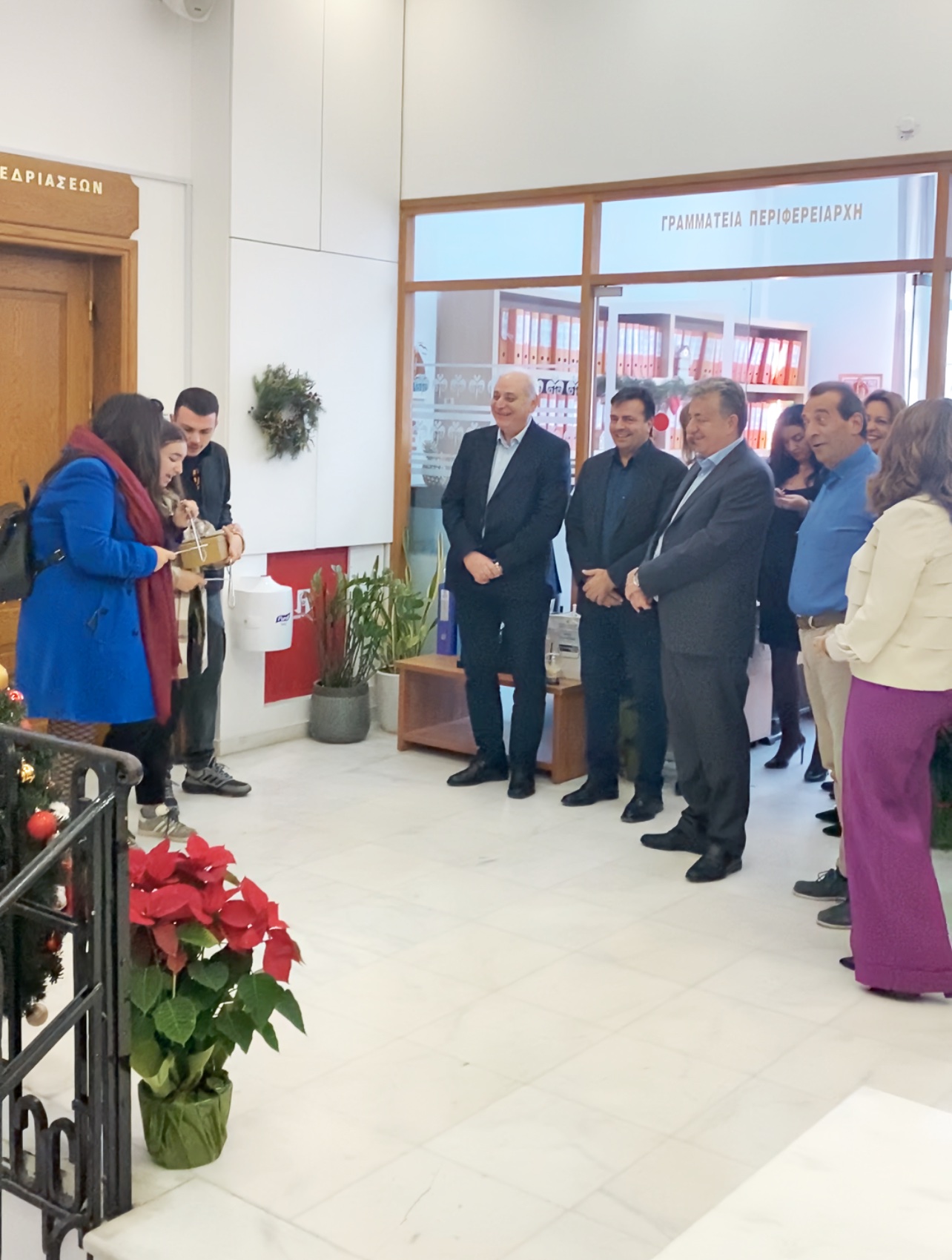 Τα κάλαντα έψαλλαν επίσης στον Περιφερειάρχη, τον Πρόεδρο του Περιφερειακού Συμβουλίου και Αντιπεριφερειάρχες παιδιά από τη νεολαία της ΚΝΕ, ανταλλάσσοντας ευχές για καλές γιορτές.