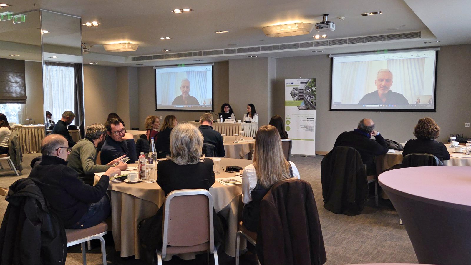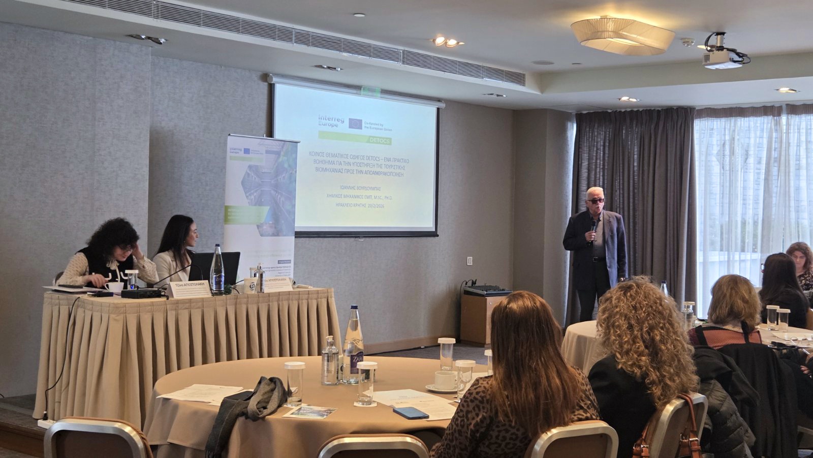 Στη συνέχεια, ο Χημικός Μηχανικός Γιάννης Βουρδουμπάς παρουσίασε τον Κοινό Θεματικό Οδηγό DETOCS, προτείνοντας τεχνικά και οικονομικά εφαρμόσιμες πρακτικές για την απανθρακοποίηση των ξενοδοχείων. Μεταξύ αυτών, ανέφερε την παραγωγή ενέργειας με φωτοβολταϊκά και ηλιακούς συλλέκτες, τη χρήση αντλιών θερμότητας υψηλής απόδοσης, τη μόνωση κτιρίων και την εγκατάσταση αυτόματων συστημάτων ελέγχου κατανάλωσης.