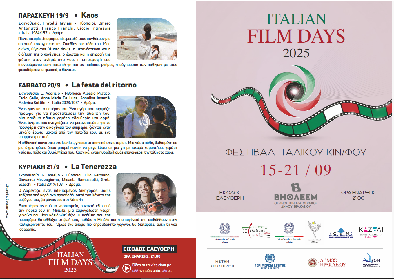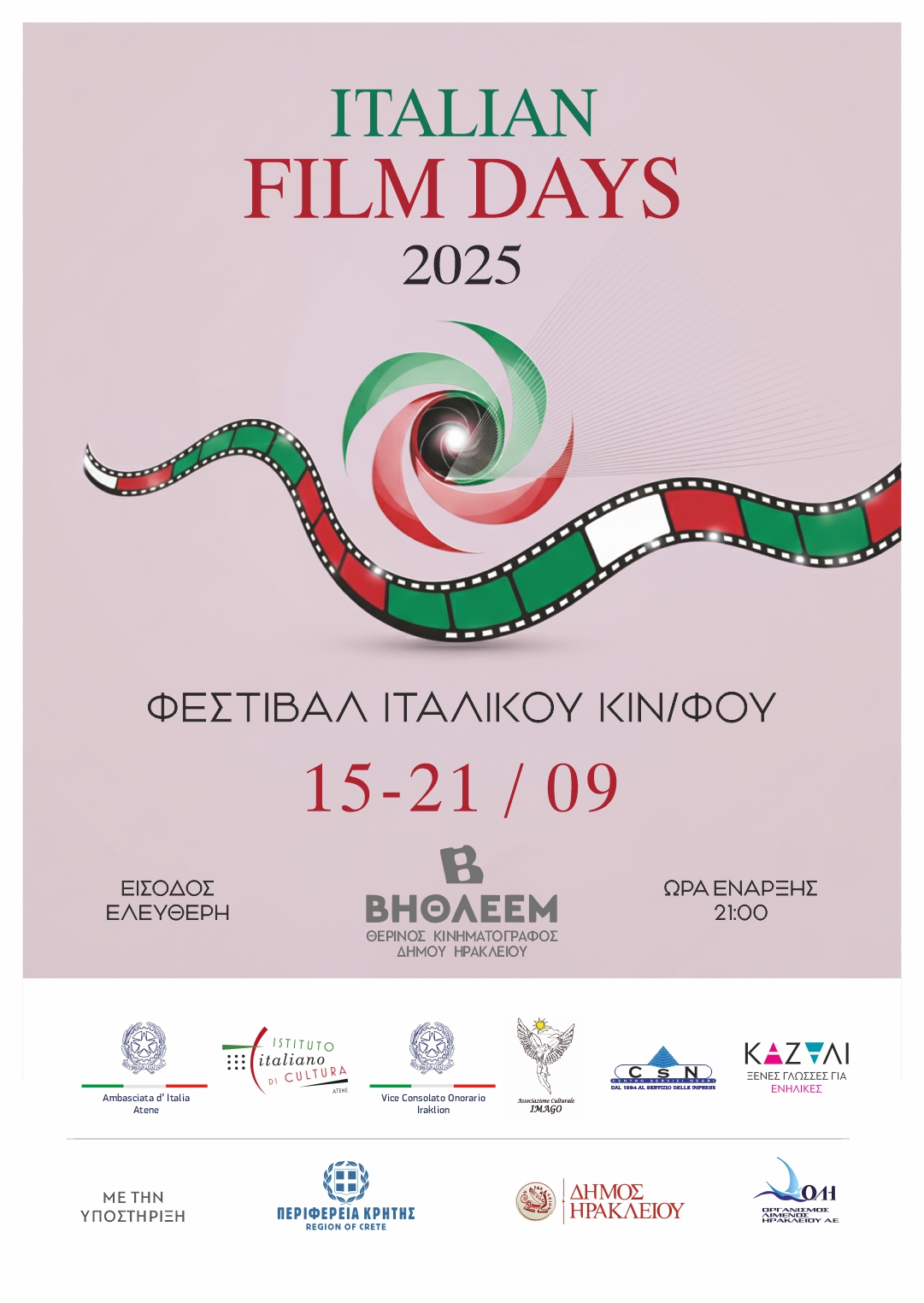 Φεστιβάλ Ιταλικού Κινηματογράφου, «Italian Film Days 2025» πραγματοποιείται από τη Δευτέρα, 15 Σεπτεμβρίου έως την Κυριακή, 21 Σεπτεμβρίου 2025 και διοργανώνεται, με την υποστήριξη της Περιφέρειας Κρήτης, την Πρεσβεία της Ιταλίας στην Ελλάδα, το Ιταλικό Μορφωτικό Ινστιτούτο Αθηνών, τον Πολιτιστικό Σύλλογο IMAGO και το Επίτιμο Προξενείο της Ιταλίας, σε συνεργασία με τον Δήμο Ηρακλείου, τον Οργανισμό Λιμένος Ηρακλείου Α.Ε. και το Κέντρο Ξένων Γλωσσών ΚΑΖΑΛΙ.