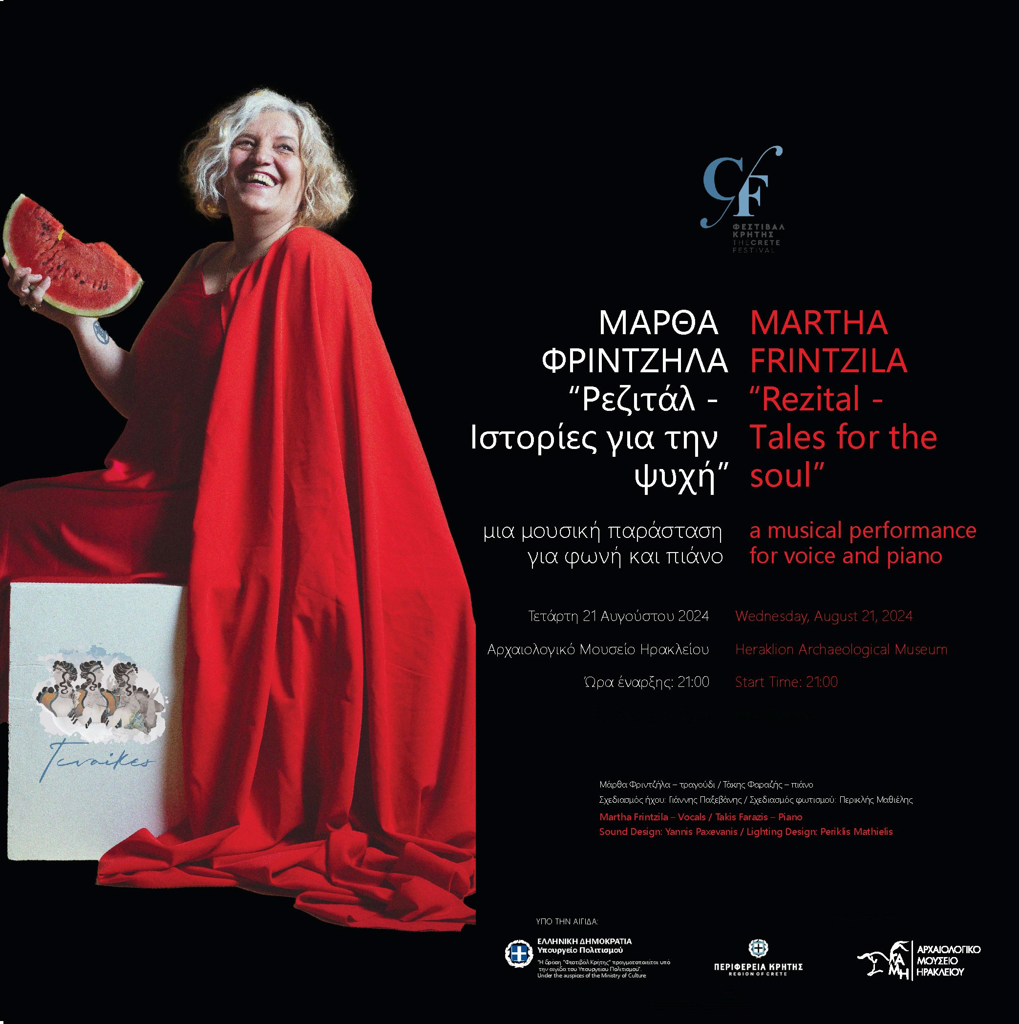Η Περιφέρεια Κρήτης και το Αρχαιολογικό Μουσείο Ηρακλείου συνδιοργανώνουν μουσική παράσταση για φωνή και πιάνο με την Μάρθα Φριντζήλα, με τίτλο: “Ρεζιτάλ – Ιστορίες για την ψυχή”.