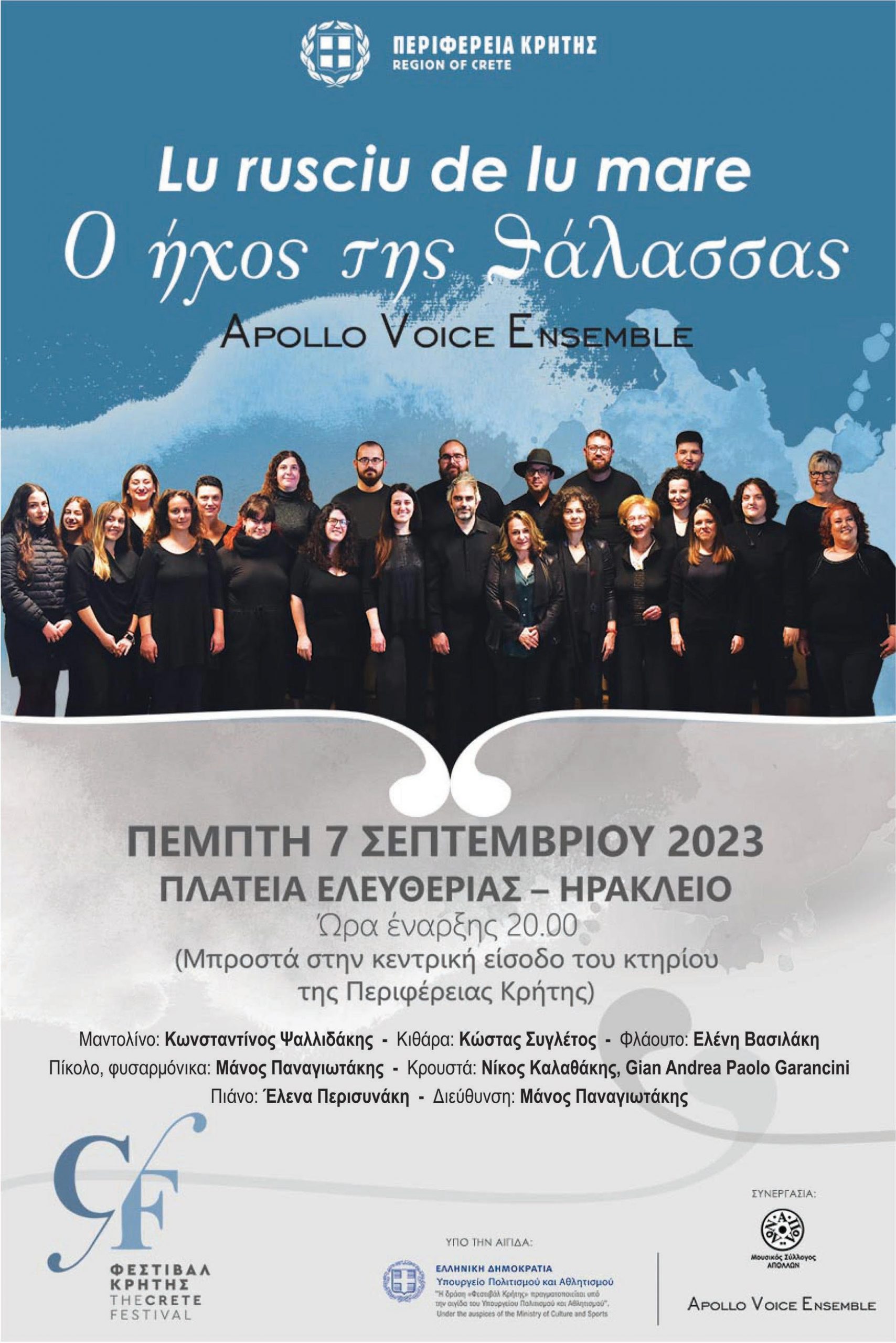Στο πλαίσιο του Φεστιβάλ Κρήτης,  που διοργανώνει η Περιφέρεια Κρήτης, για τρίτη χρόνια φέτος, υπό την αιγίδα του υπουργείου Πολιτισμού, θα παρουσιαστεί συναυλία με το Φωνητικό σύνολο Apollo Voice Ensemble και συνοδεία οργανικού συνόλου με τίτλο  “Lu rusciu de lu mare” – Ο ήχος της θάλασσας.