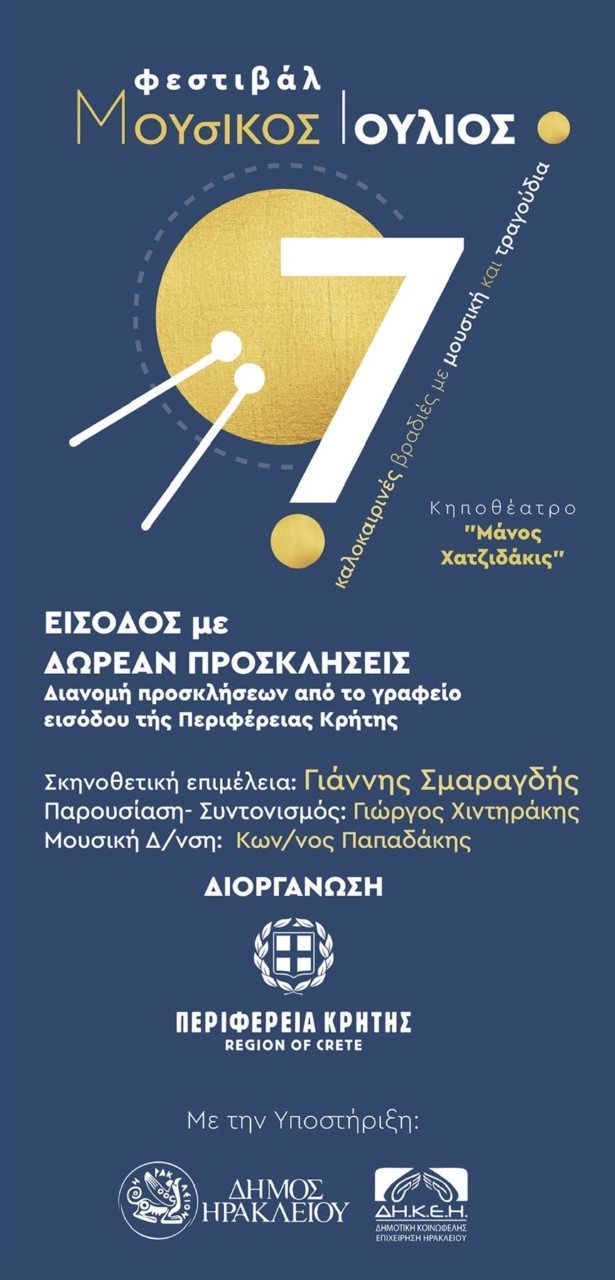 Όπως τονίστηκε στη διάρκεια συνέντευξης τύπου, πρόκειται για μουσικές πολιτιστικές εκδηλώσεις πολυθεματικές με Κρήτες καλλιτέχνες αλλά και καθιερωμένους στο κοινό ερμηνευτές. Στα πλαίσια αυτής των πολιτιστικών δράσεων για πρώτη φορά η Περιφέρεια διοργανώνει ένα φεστιβάλ  επτά συνεχόμενων ημερών στο θερινό θέατρο «Μάνος Χατζιδάκις» του Ηρακλείου με ελεύθερη είσοδο για το κοινό.