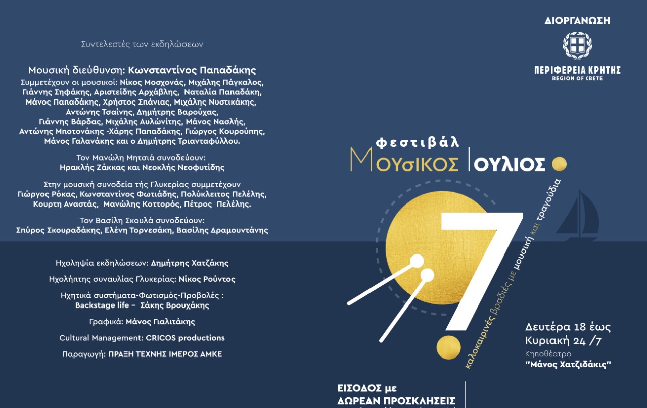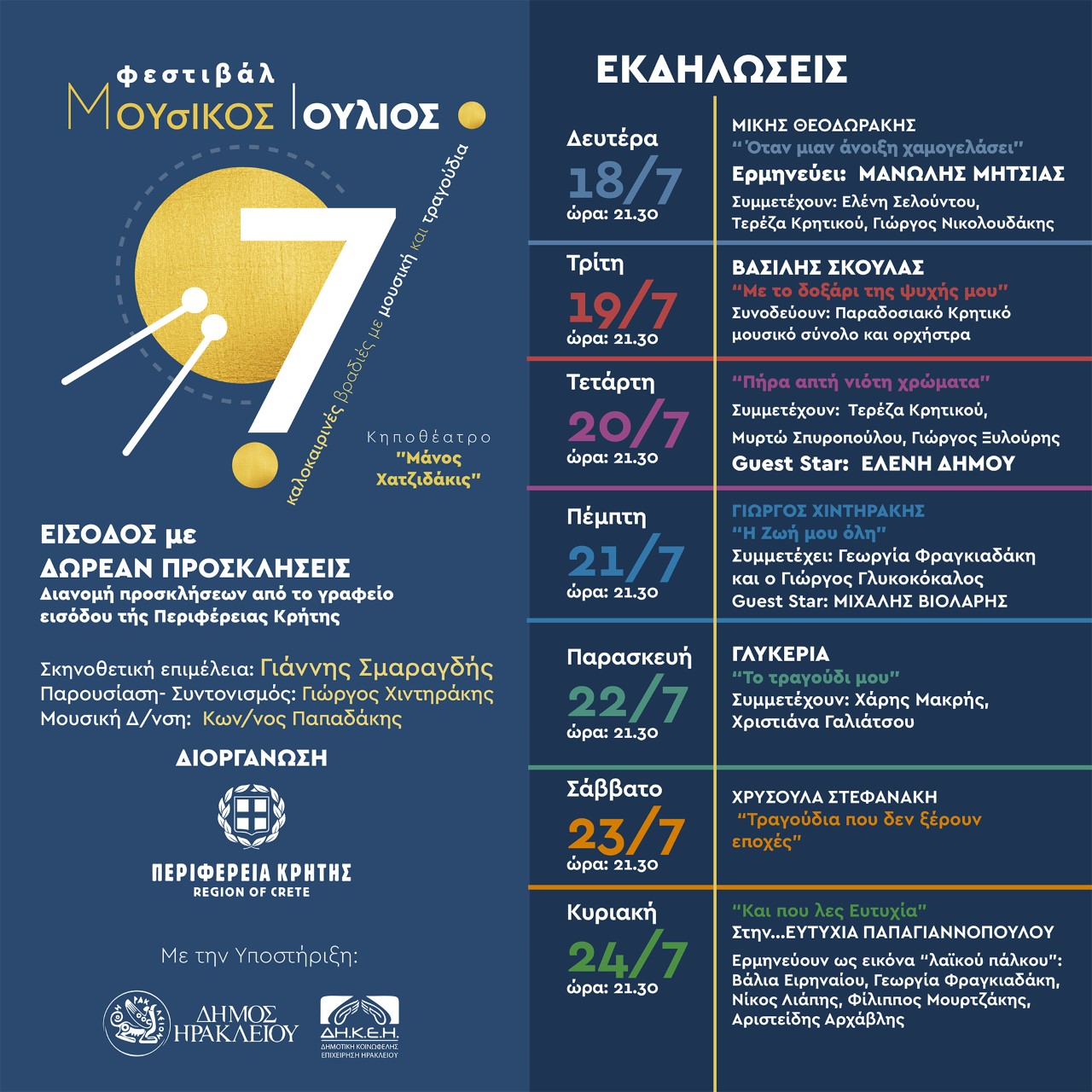 Το Φεστιβάλ “Μουσικός Ιούλιος” ξεκινά την Δευτέρα 18 Ιουλίου με το αφιέρωμα στον Μίκη Θεοδωράκη Όταν μιαν άνοιξη χαμογελάσει” Ερμηνεύει o Μανώλης Μητσιάς και συμμετέχουν 3 εξαιρετικοί Κρήτες τραγουδιστές η Ελένη Σελούντου, η Τερέζα Κρητικού και ο Γιώργος Νικολουδάκης. Συνοδεύει ορχήστρα 10 μουσικών.