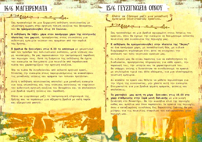 Οι εκδηλώσεις ξεκινούν στις 18.00 το απόγευμα της Παρασκευής 14 Ιουνίου από την κεντρική πλατεία του χωριού με τα μαγειρέματα .Θα παρουσιαστούν πιάτα της Κρητικής κουζίνας και μη ,μαγειρεμένα από τις γυναίκες του χωριού .Οσοι βρεθούν θα δοκιμάσουν και εξαιρετικά κρασιά της περιοχής.