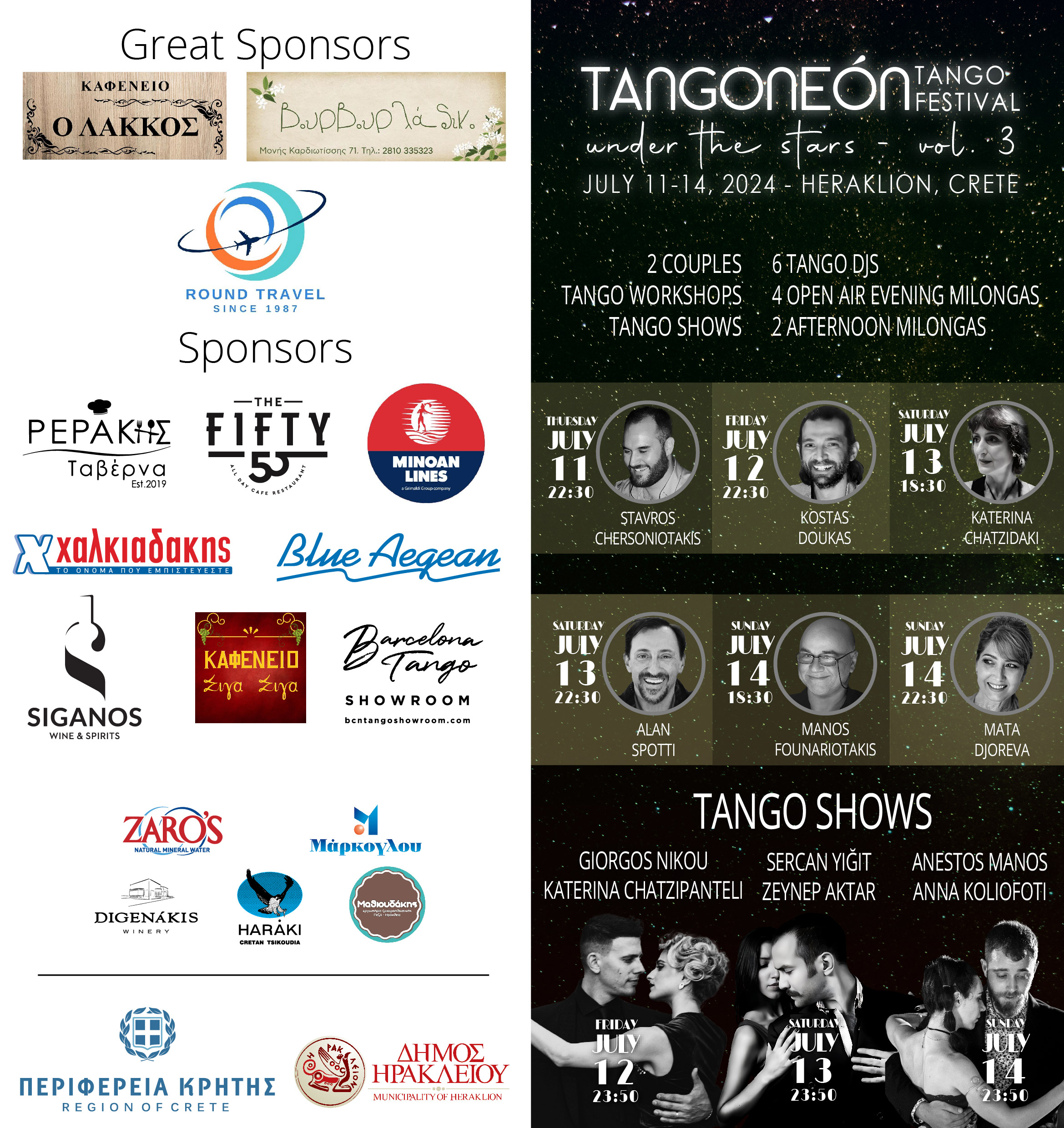 Ο πολιτιστικός σύλλογος TANGONEÓN από 11 έως 14 Ιουλίου 2024 διοργανώνει το «TANGONEÓN TANGO FESTIVAL – Under the stars», ένα μεγάλο χορευτικό φεστιβάλ με την υποστήριξη της Περιφέρειας Κρήτης και του Δήμου Ηρακλείου. Το φεστιβάλ θα αποτελέσει μία μεγάλη γιορτή αφιερωμένη στο τάνγκο και στη μακροχρόνια συνεισφορά του συλλόγου στο πολιτιστικό προφίλ της Κρήτης. Η εκδήλωση απευθύνεται σε χορευτές τάνγκο ή λάτρεις της τάνγκο μουσικής, εντός Κρήτης και εκτός, σε τουρίστες που σχετίζονται με την παγκόσμια τάνγκο κοινότητα και σε νέο κόσμο που θέλει να γνωρίσει το τάνγκο, σε ένα από τα πιο γοητευτικά σημεία της πόλης κατά τους καλοκαιρινούς μήνες, τα Ενετικά τείχη του Ηρακλείου.