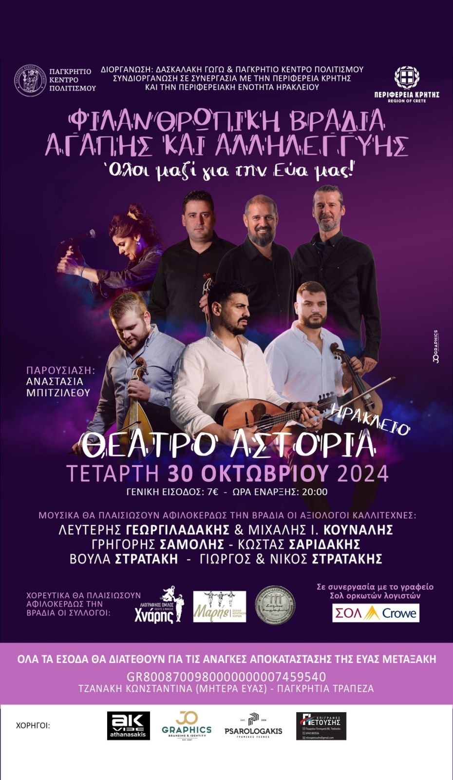 Το Παγκρήτιο Κέντρο Πολιτισμού με την στήριξη της Περιφέρειας Κρήτης, διοργανώνει μεγάλη «ΦΙΛΑΝΘΡΩΠΙΚΗ ΒΡΑΔΙΑ ΑΓΑΠΗΣ ΚΑΙ ΑΛΛΗΛΕΓΓΥΗΣ» για να στηριχθεί οικονομικά η ιατρική αποκατάσταση της 16χρόνης μαθήτριας Εύας Μεταξάκη, μετά από σοβαρό τραυματισμό της σε τροχαίο.