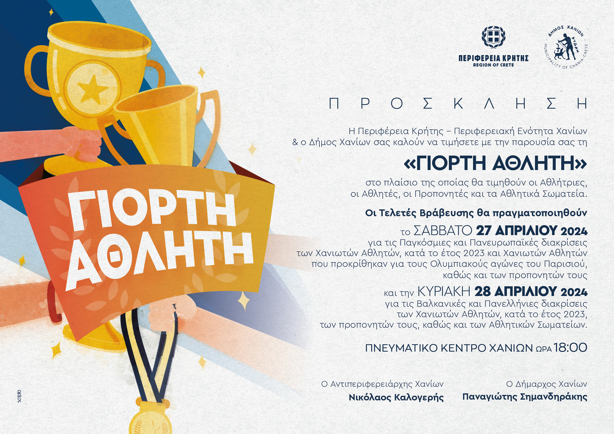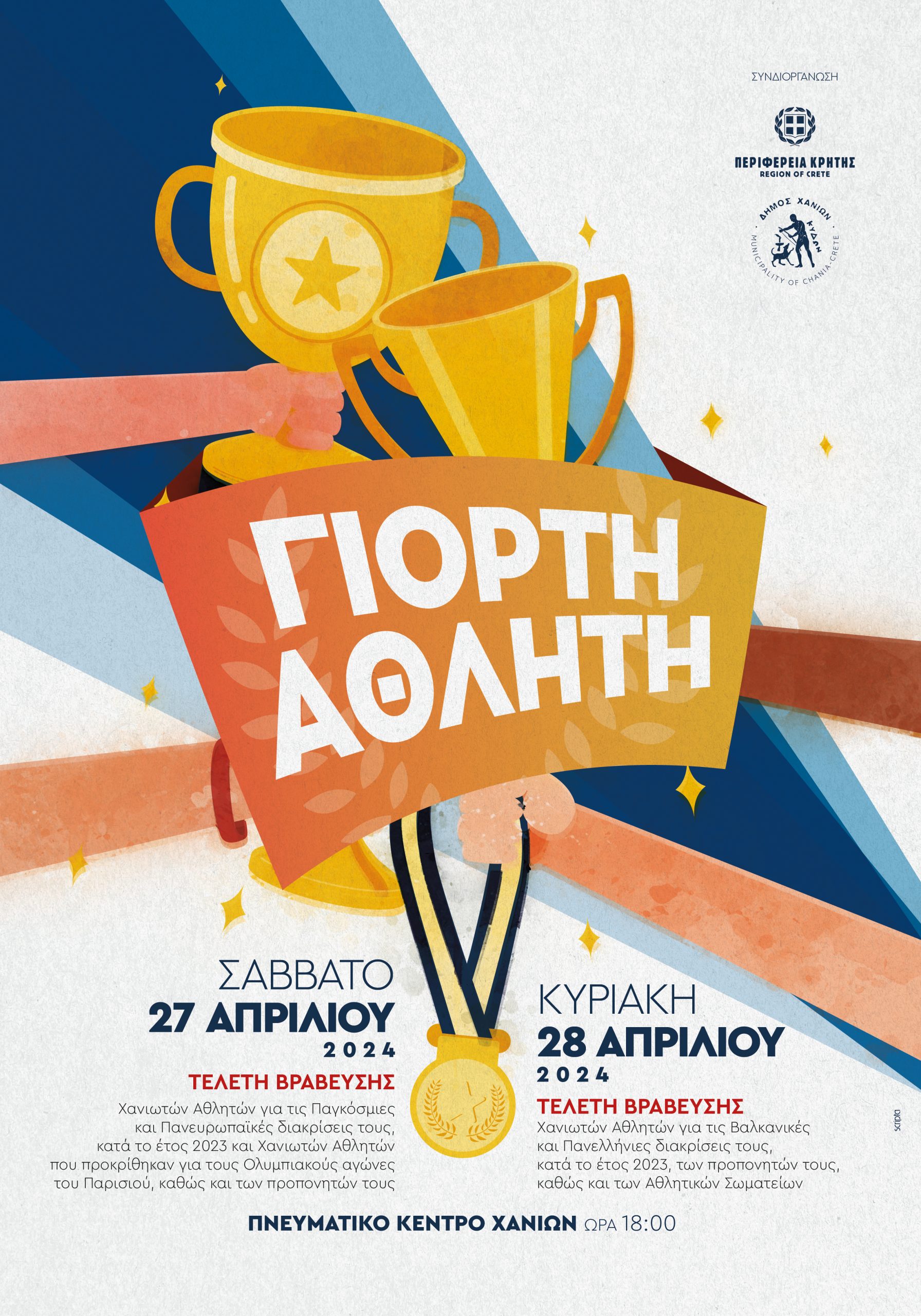 στο πλαίσιο της οποίας θα τιμηθούν οι Αθλητές & οι Αθλήτριες, οι Προπονητές & οι Προπονήτριες, καθώς και τα Αθλητικά Σωματεία των Χανίων για τις διακρίσεις που πέτυχαν κατά το έτος 2023, σύμφωνα με τα στοιχεία που προσκόμισαν οι Ομοσπονδίες τους.