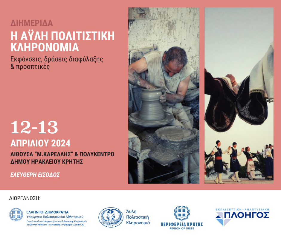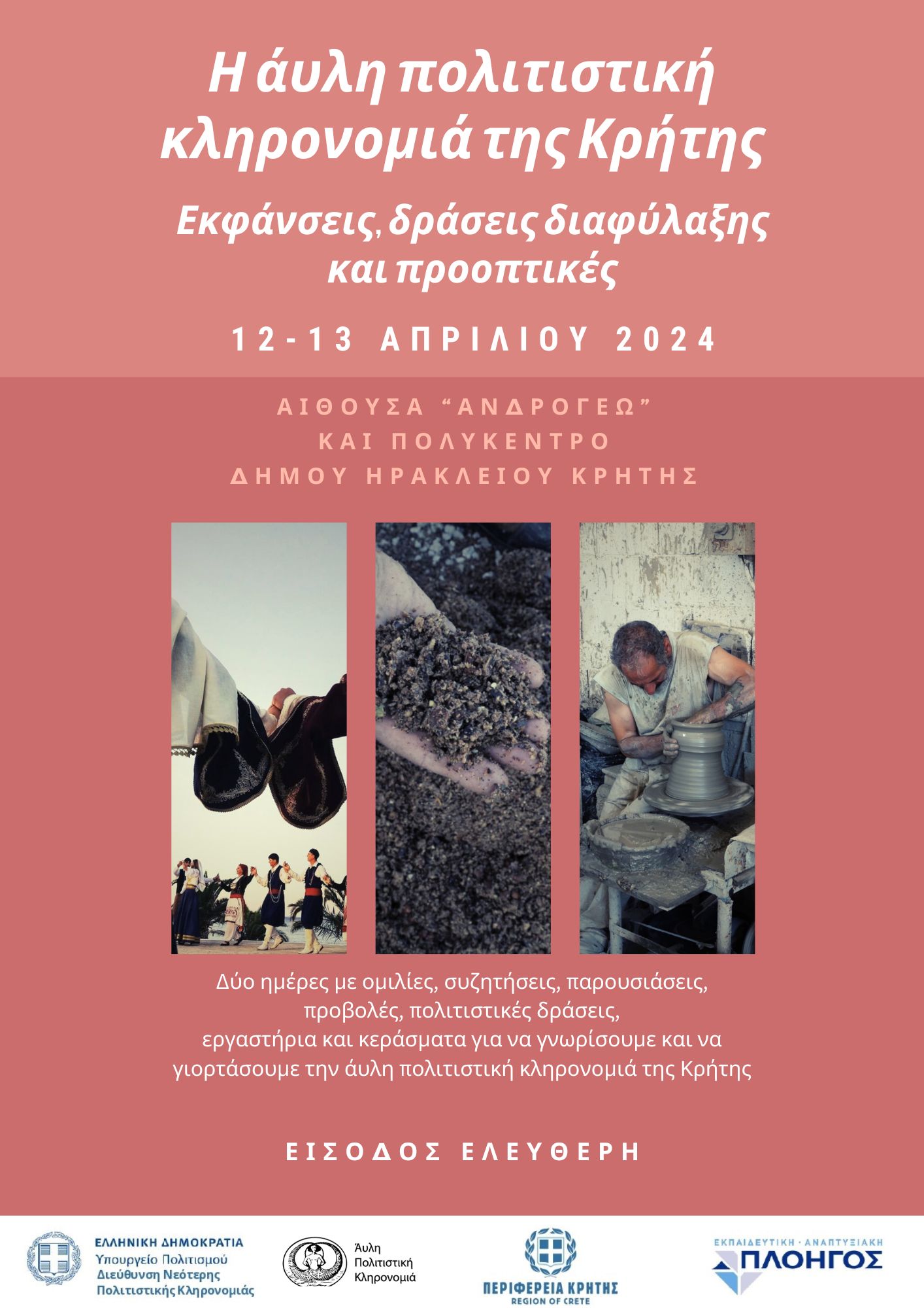 Το Υπουργείο Πολιτισμού-Διεύθυνση Νεότερης Πολιτιστικής Κληρονομιάς, σε συνεργασία με την Περιφέρεια Κρήτης και την Εκπαιδευτική-Αναπτυξιακή «Πλοηγός» διοργανώνουν διημερίδα, με θέμα «Η Άυλη Πολιτιστική Κληρονομιά. Εκφάνσεις, Δράσεις Διαφύλαξης και Προοπτικές». Στόχος της διημερίδας είναι η ανάδειξη της Άυλης Πολιτιστικής Κληρονομιάς της Κρήτης, και θα πραγματοποιηθεί την Παρασκευή 12 και το Σάββατο 13 Απριλίου 2024, στην Αίθουσα «Ανδρόγεω» και στο Πολύκεντρο του Δήμου Ηρακλείου.