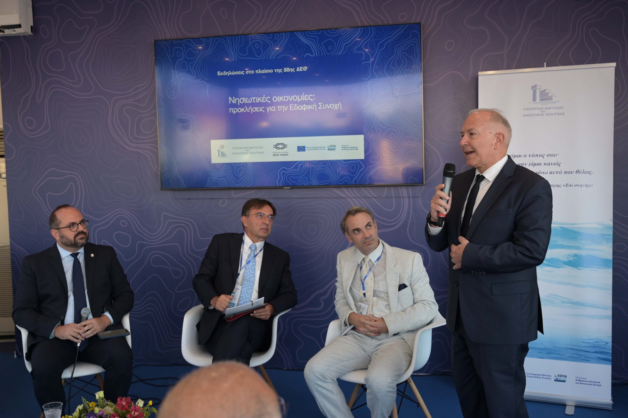 Στην αρχή απεύθυνε χαιρετισμό ο Υφυπουργός Αιγαίου και Νησιωτικής Πολιτικής κ. Γκίκας ενώ το συντονισμό της συζήτησης είχε ο Μανώλης Κουτουλάκης, Γενικός Γραμματέας Αιγαίου και Νησιωτικής Πολιτικής. Στη συζήτηση συμμετείχαν διακεκριμένοι ομιλητές από τον ακαδημαϊκό, θεσμικό και επιχειρηματικό χώρο :