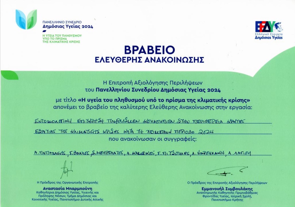 Το πρώτο πανελλήνιο βραβείο για την επιστημονική μελέτη που αφορά την εντομολογική επιτήρηση των πληθυσμών κουνουπιών στο νησί εξαιτίας της κλιματικής κρίσης κατά τη χειμερινή περίοδο 2023-2024 απέσπασε η Περιφέρεια Κρήτης. Η μελέτη της Περιφέρειας Κρήτης αξιολογήθηκε ανάμεσα σε 130 ελεύθερες ανακοινώσεις και αναρτημένες ανακοινώσεις, ως η καλύτερη.