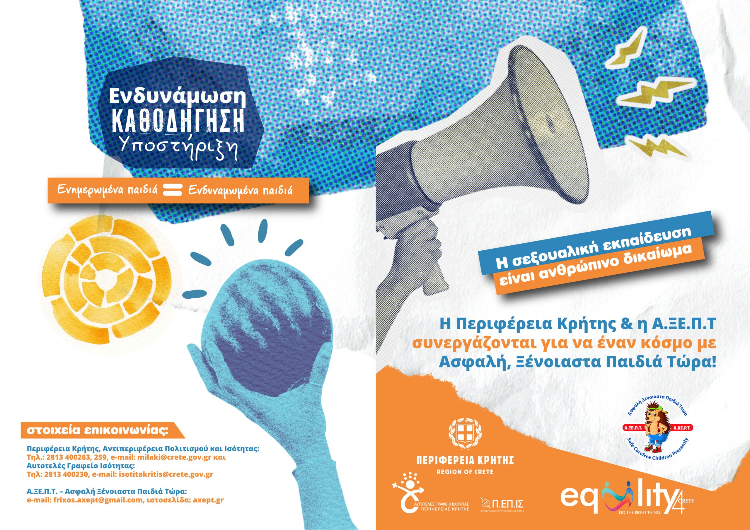 Η Περιφέρεια Κρήτης, Αυτοτελές Γραφείο Ισότητας, σε συνεργασία με την Α.ΞΕ.Π.Τ. – Ασφαλή Ξέγνοιαστα Παιδιά Τώρα – υλοποιούν τα τελευταία χρόνια μια σειρά δράσεων σεξουαλικής εκπαίδευσης που ενισχύουν τη γνώση, τη συνειδητοποίηση και κυρίως την ενδυνάμωση παιδιών, γονέων και εκπαιδευτικών, σε συνεργασία με συλλόγους εκπαιδευτικών, συλλόγους γονέων και κηδεμόνων και πολιτιστικούς συλλόγους.