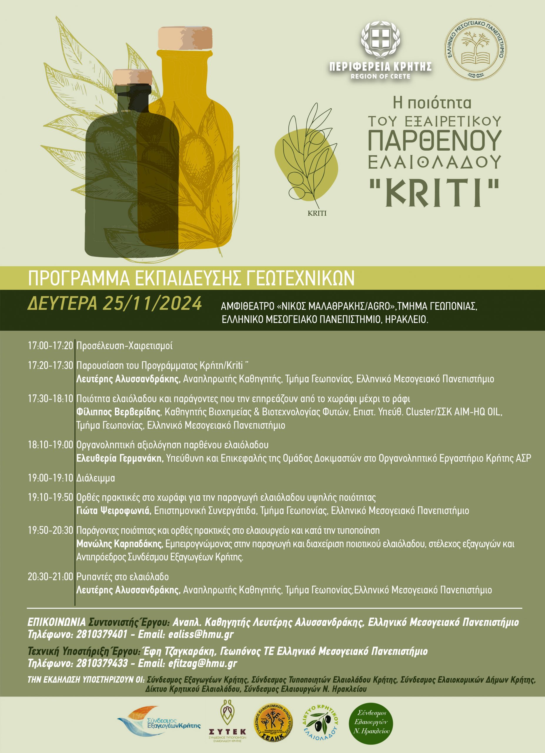 Όλοι μαζί λοιπόν, η Περιφέρεια Κρήτης, τα εκπαιδευτικά μας ιδρύματα, οι φορείς του Εξαιρετικού Παρθένου Ελαιόλαδου “Κρήτη/Kriti” μαζί με τους γεωτεχνικούς μας, μέσα από μια καλή συνεργασία θα καταφέρουμε να στηρίξουμε την ελαιοκαλλιέργεια αλλά και το εθνικό μας προϊόν που είναι το Εξαιρετικό Παρθένο Ελαιόλαδο “Κρήτη/Kriti”».