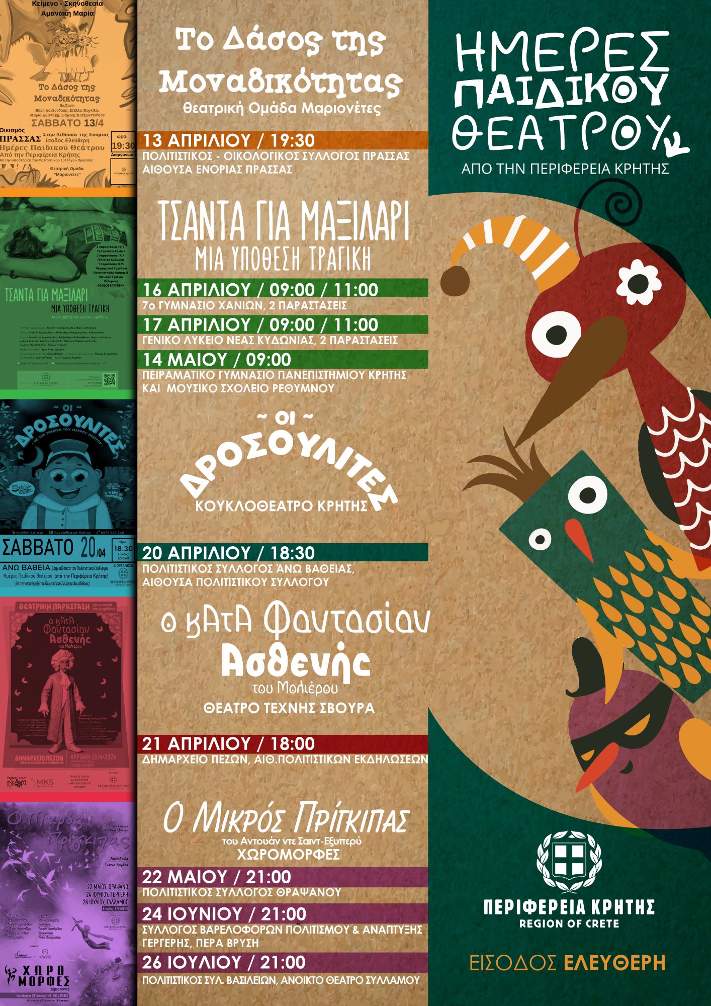 Συνεχίζονται οι «Ημέρες Παιδικού Θεάτρου» από την Περιφέρεια Κρήτης, με σειρά θεατρικών παραστάσεων που ξεκινούν στις 13 Απριλίου και πρόκειται να συνεχιστούν για όλο το χρόνο. Μαθήτριες και μαθητές, εκπαιδευτικοί και γονείς θα έχουν την ευκαιρία να παρακολουθήσουν παραστάσεις ψυχαγωγίας, ευαισθητοποίησης και ενημέρωσης σχετικά με σημαντικά διαχρονικά ζητήματα.