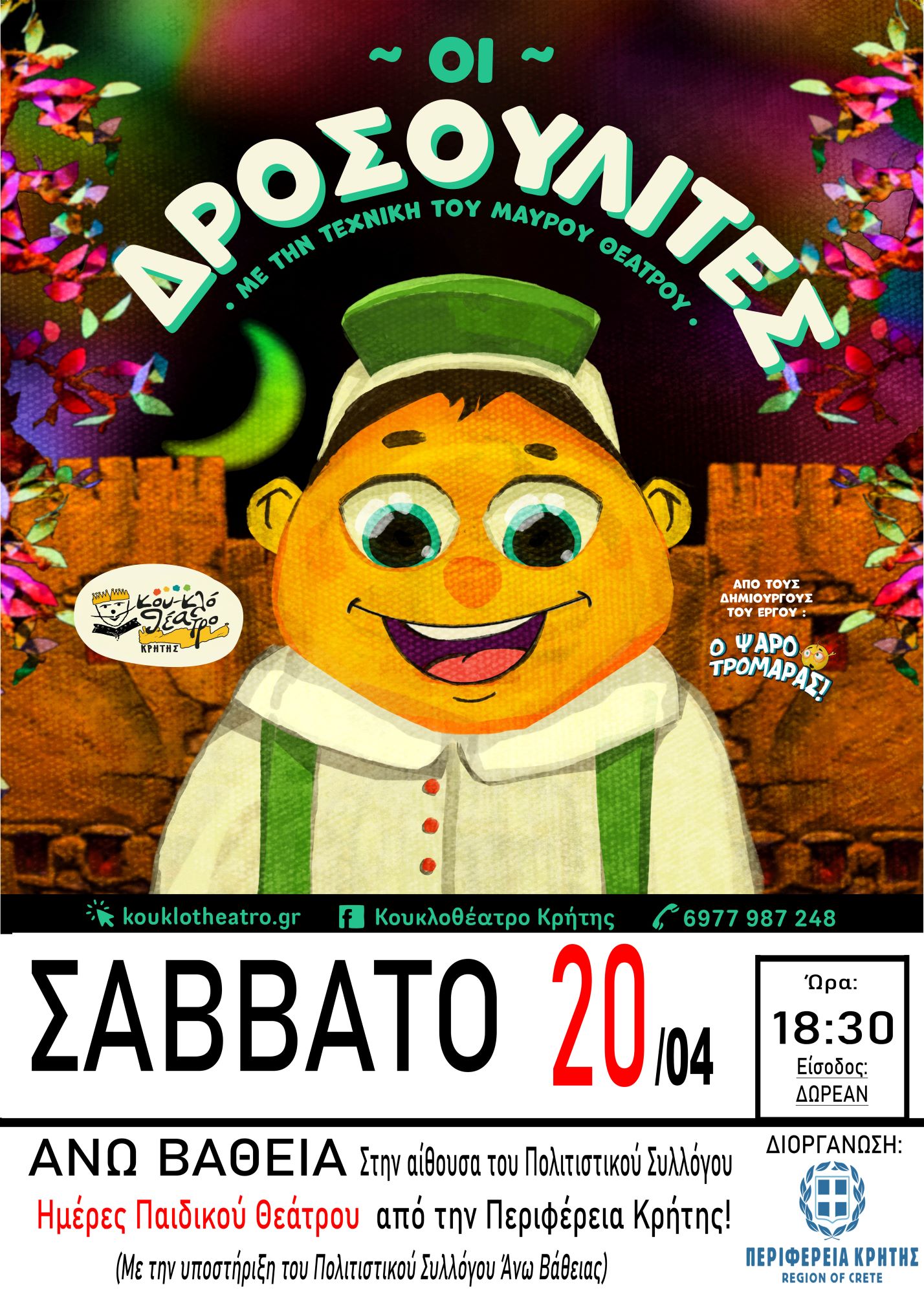 «Οι Δροσουλίτες», από το Κουκλοθέατρο Κρήτης, στις 20 Απριλίου, στις 6:30μ.μ., στην Αίθουσα του Πολιτιστικού Συλλόγου Άνω Βάθειας, με την υποστήριξη του Συλλόγου.