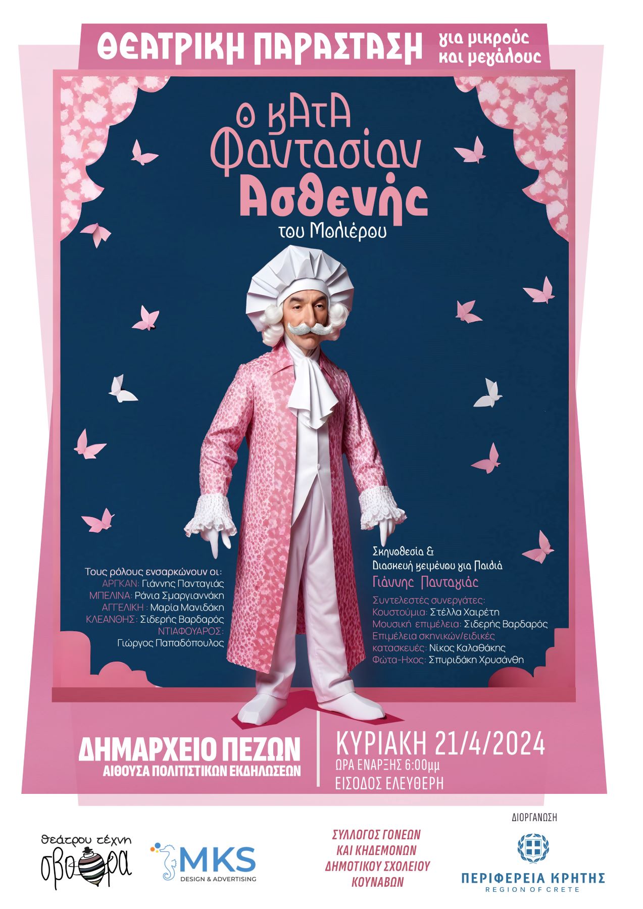 «Ο Κατά Φαντασίαν Ασθενής» του Μολιέρου, από το Θέατρο Τέχνης Σβούρα, στις 21 Απριλίου, στις 6:00μ.μ., στην Αίθουσα Πολιτιστικών Εκδηλώσεων στο Δημαρχείο των Πεζών, με την υποστήριξη του Συλλόγου Γονέων και Κηδεμόνων του Δημοτικού Σχολείου Κουνάβων.