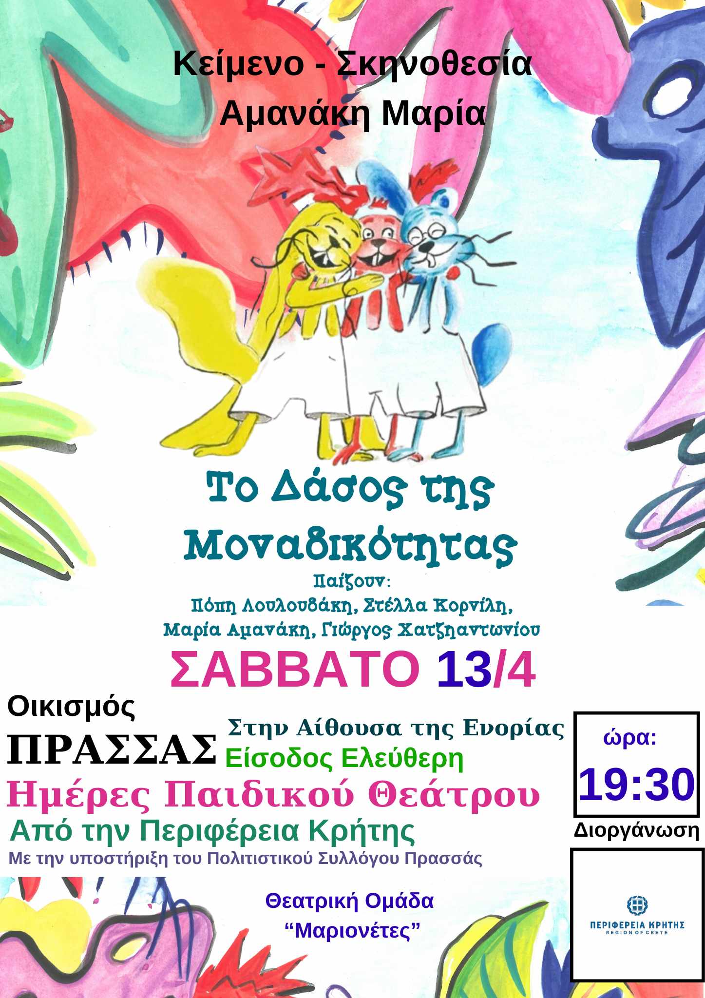 «Το Δάσος της Μοναδικότητας», από τη Θεατρική Ομάδα Μαριονέτες, στις 13 Απριλίου, στις 7:30μ.μ., στην αίθουσα της Ενορίας της Πρασσάς, με την υποστήριξη του Πολιτιστικού-Οικολογικού Συλλόγου Πρασσάς.