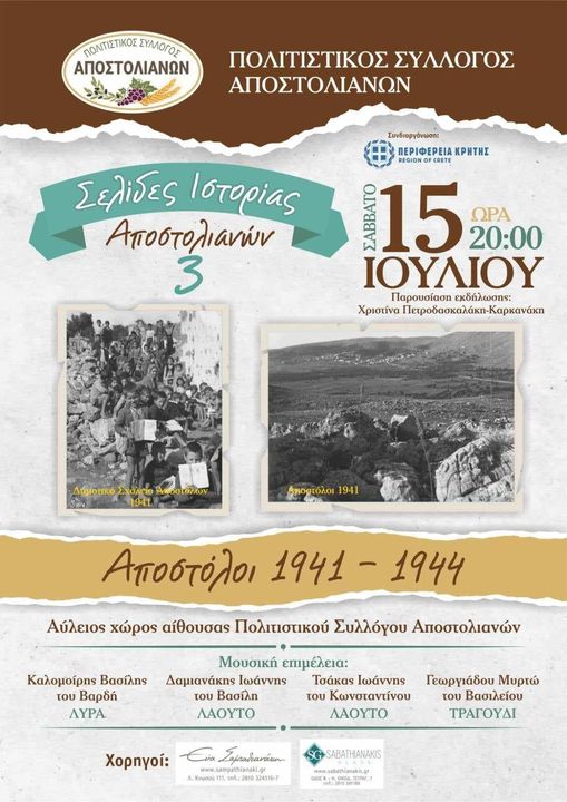 Το Σάββατο 15 Ιουλίου 2023 και ώρα 20.00, στον αύλειο χώρο του Πολιτιστικού Συλλόγου στους Αποστόλους Πεδιάδος, ο Πολιτιστικός Σύλλογος Αποστολιανών, με τη στήριξη της Περιφέρειας Κρήτης, διοργανώνει Ημερίδα με θέμα: «Ιστορική Έρευνα την περίοδο της Κατοχής 1941-1944» , Σελίδες Ιστορία Αποστολιανών 3