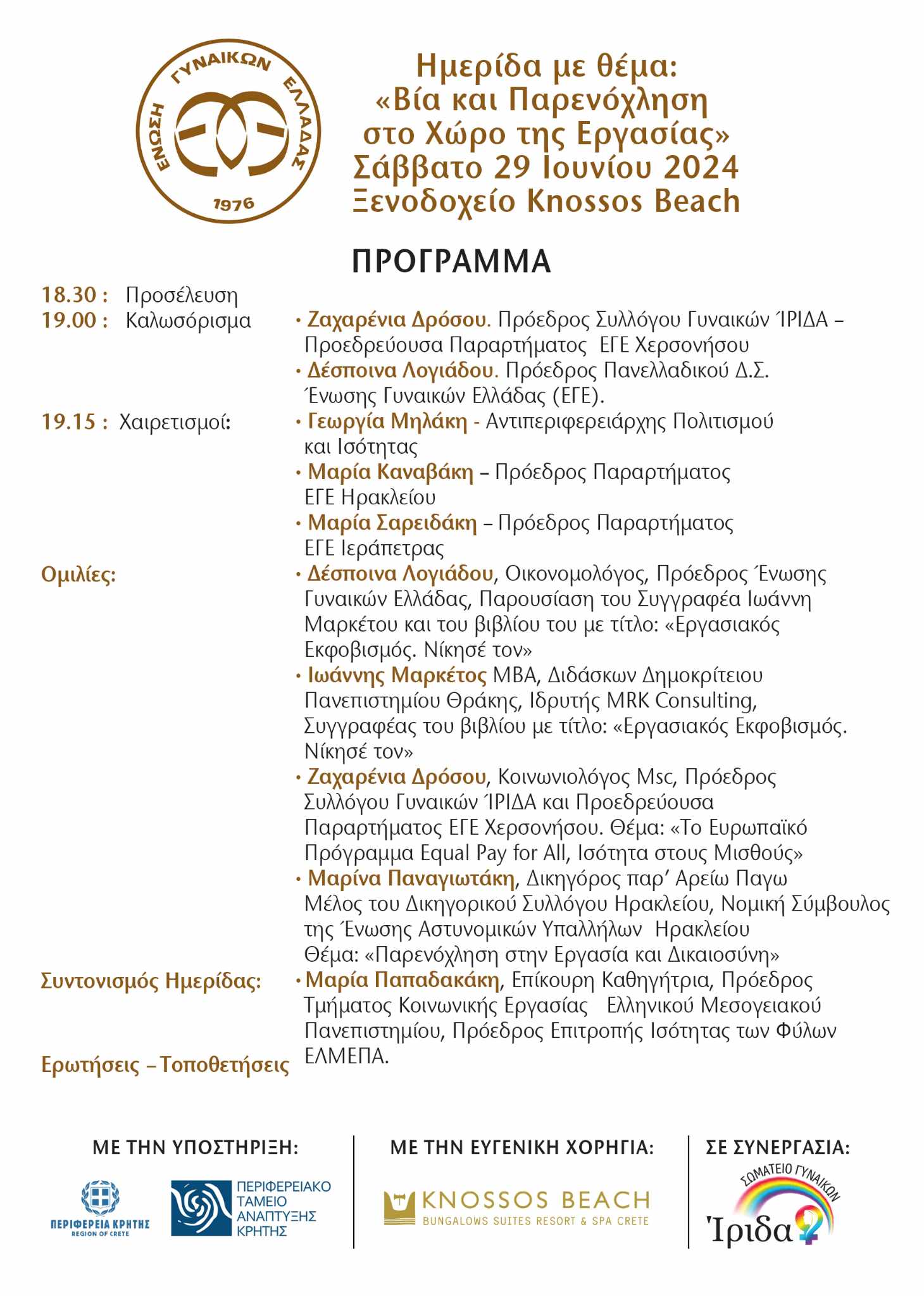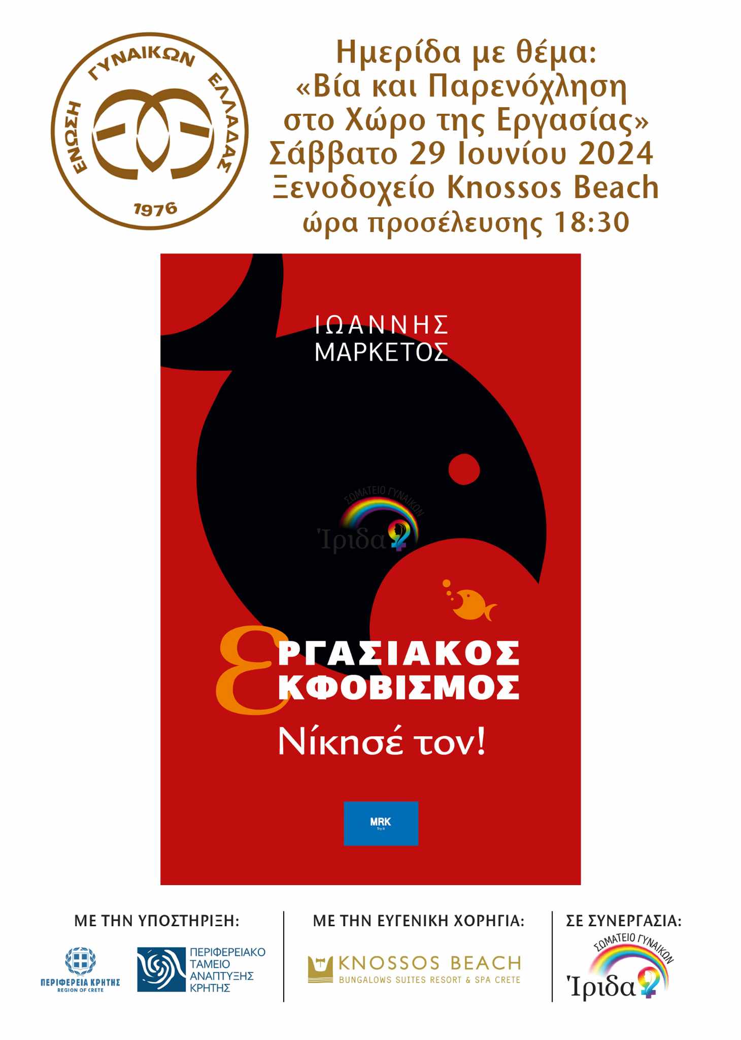 Η Ένωση Γυναικών Ελλάδας (ΕΓΕ) στις 29 Ιουνίου ημέρα Σάββατο και ώρα 18.30 στο KNOSSOS BEACH (Κοκκίνη Χάνι), διοργανώνει ημερίδα με θέμα «Βία και Παρενόχληση στο Χώρο της Εργασίας». Η ημερίδα πραγματοποιείται με την υποστήριξη της Περιφέρειας Κρήτης. Η ημερίδα διοργανώνεται σε συνεργασία με το Σύλλογο Γυναικών ΊΡΙΔΑ και την ευγενική χορηγία του Ξενοδοχείου KNOSSOS BEACH.