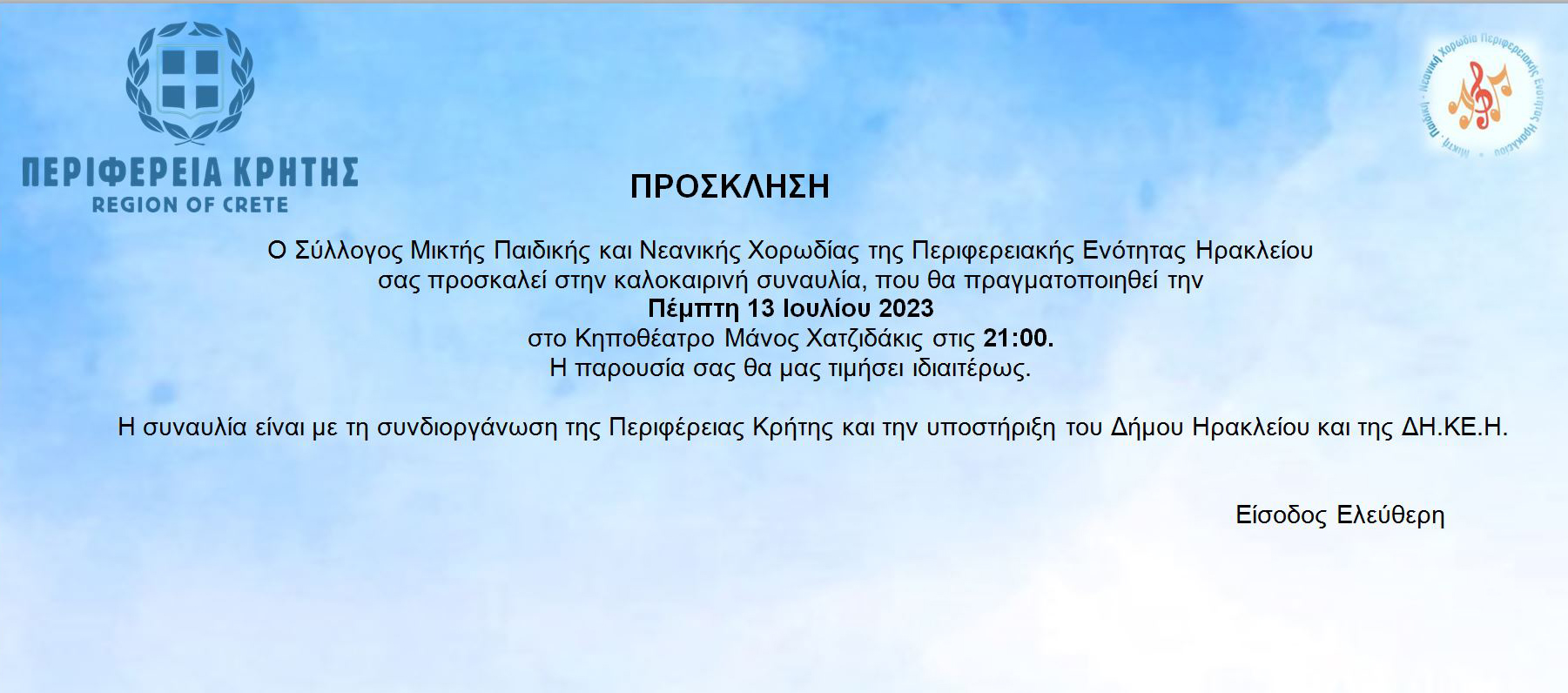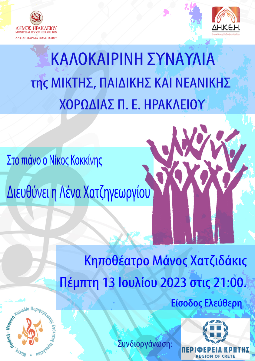Με τη συνδιοργάνωση της Περιφέρειας Κρήτης και με την υποστήριξη του Δήμου Ηρακλείου και της ΔΗ.ΚΕ.Η., ο Σύλλογος Μικτής, Παιδικής και Νεανικής Χορωδίας της Περιφερειακής Ενότητας Ηρακλείου, παρουσιάζει την καλοκαιρινή του συναυλία, που θα πραγματοποιηθεί την Πέμπτη 13 Ιουλίου 2023 στο Κηποθέατρο Μάνος Χατζιδάκις στις 21:00, με ελεύθερη είσοδο για το κοινό.