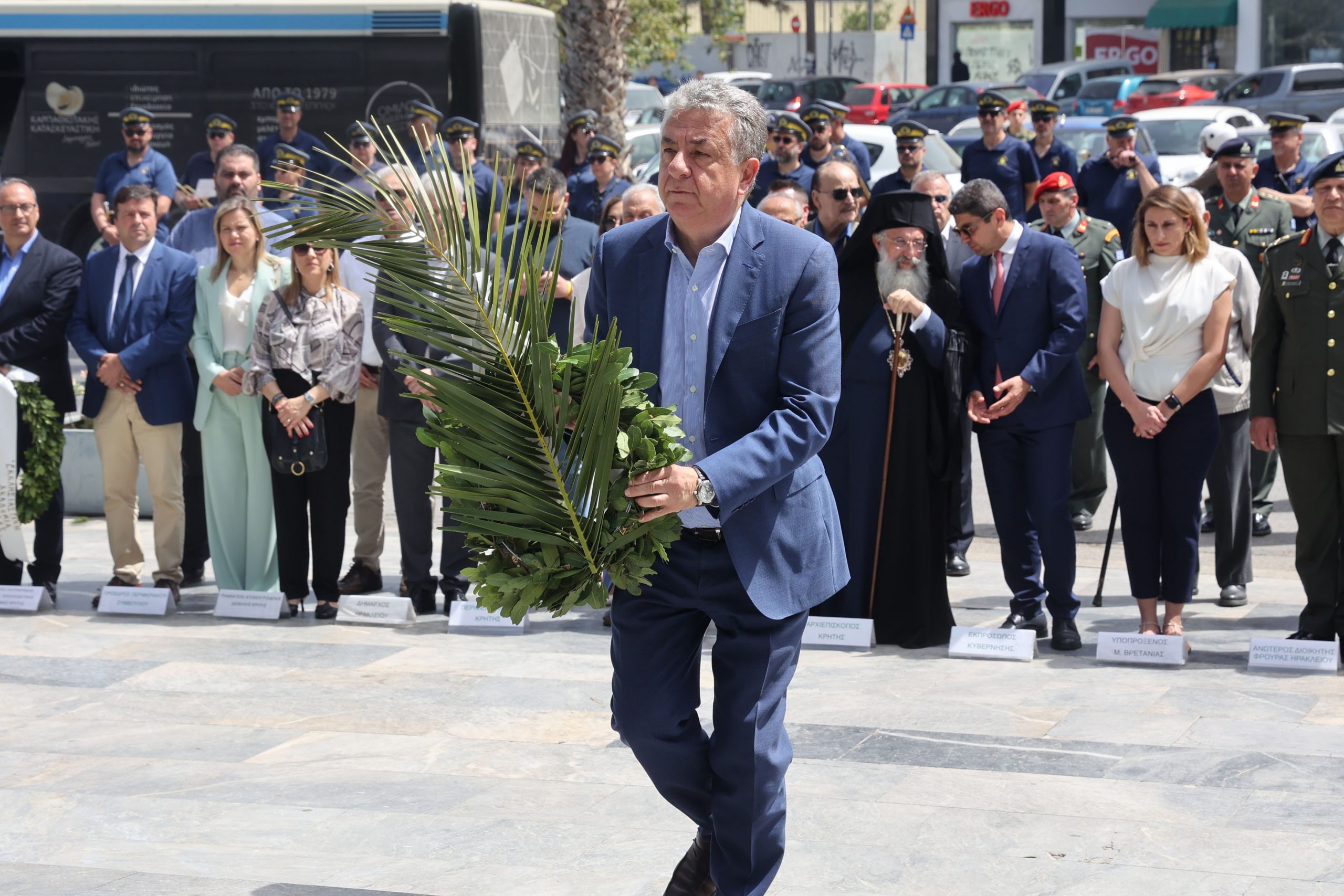 Στη συνέχεια πραγματοποιήθηκε επιμνημόσυνη δέηση από τον Σεβασμιότατο Αρχιεπίσκοπο Κρήτης κ. Ευγένιο και τελετή κατάθεσης στεφάνων στο Μνημείο της «Μάχης Κρήτης» από: τον εκπρόσωπο της Κυβέρνησης, Υπουργό Αγροτικής Ανάπτυξης και Τροφίμων Λευτέρη Αυγενάκη, την Υποπρόξενο Μ. Βρετανίας Αριστέα Χουρδάκη, τον Περιφερειάρχη Κρήτης Σταύρο Αρναουτάκη, τον Δήμαρχο Ηρακλείου Αλέξη Καλοκαιρινό, τη Γραμματέα Αποκεντρωμένης Διοίκησης Κρήτης Μαρία Κοζυράκη, τον Ανώτερο Διοικητή Φρουράς Ηρακλείου ως εκπρόσωπο των Ενόπλων Δυνάμεων, τους εκπροσώπους των Σωμάτων Ασφαλείας, κομμάτων, φορέων, και ενώσεων αποστράτων.