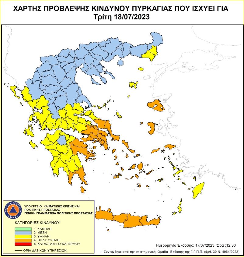 Η Πολιτική Προστασία Περιφέρειας Κρήτης ενημερώνει ότι, σύμφωνα με τον Ημερήσιο Χάρτη Πρόβλεψης Κινδύνου Πυρκαγιάς της Γενικής Γραμματείας Πολιτικής Προστασίας για αύριο Τρίτη 18 Ιουλίου 2023 η κατηγορία Κινδύνου Πυρκαγιάς για όλη την Κρήτη, είναι κατηγορίας κινδύνου: 4 (πολύ υψηλός)