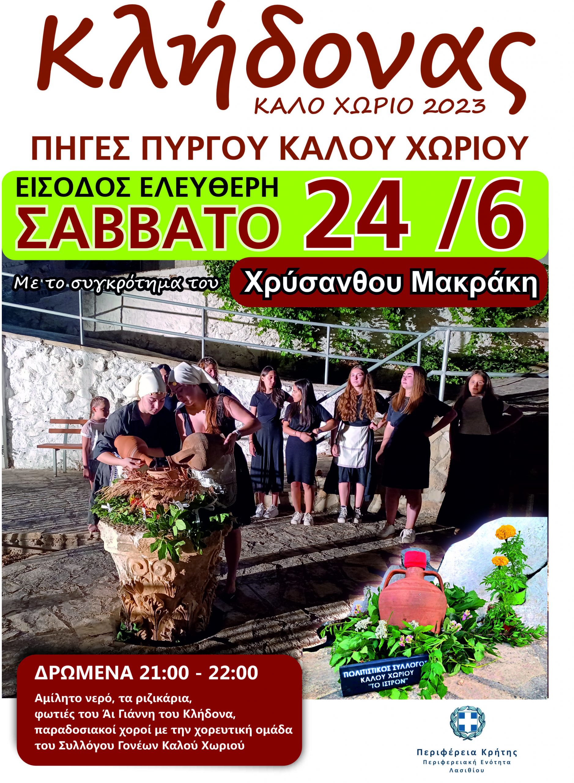 O Πολιτιστικός Σύλλογος Καλού Χωριού “Το Ίστρον” , στα πλαίσια των καλοκαιρινών εκδηλώσεων για το 2023, διοργανώνει σε συνεργασία με την Περιφέρεια Κρήτης – Περιφερειακή Ενότητα Λασιθίου , την εκδήλωση “Κλήδονας Καλό Χωριό 2023” στις πηγές του οικισμού Πύργου Καλού Χωριού Σάββατο 24 Ιουνίου 2023 και ώρα 21:00.